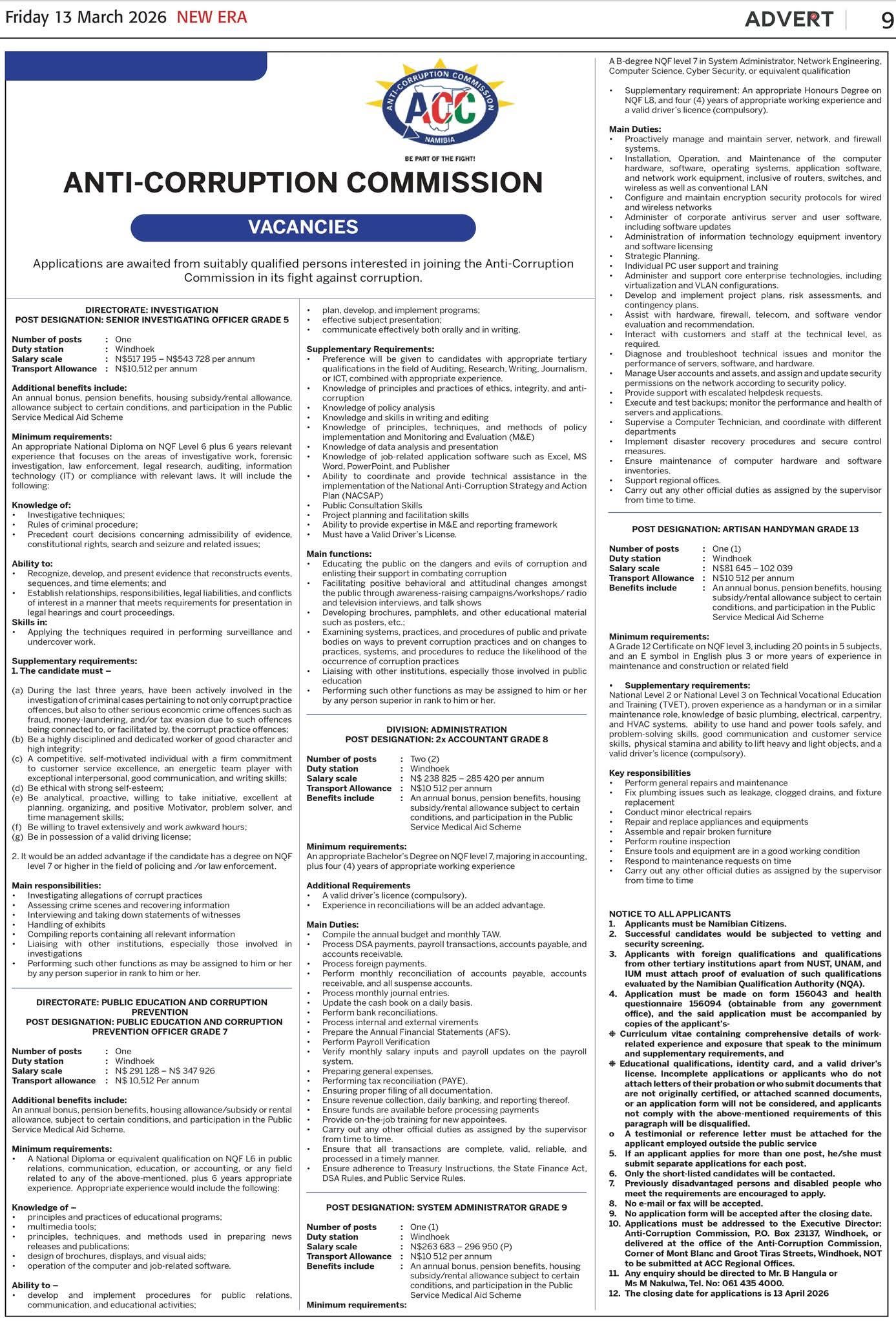 ACC Vacancies 2026, Latest Anti-Corruption Commission Job Opportunities at @acc.gov.na