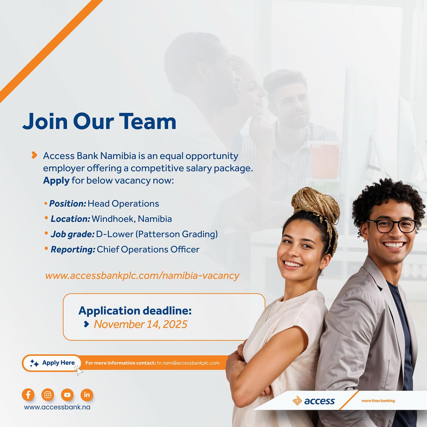 Namibian candidates seeking Access Bank Namibia job opportunities have come to the right place! This article offers detailed information on Head Operations, Contract Manager and various other job openings to help advance your career. For those interested in employment with the Namibian government and private companies, we provide up-to-date information on current Access Bank Namibia job openings. The Access Bank Namibia Vacancies Portal is known for frequently hiring for various government positions in Namibia, making it one of the most sought-after platforms. Additionally, you can download the Access Bank Namibia Application Form 2025 PDF for Namibian government jobs directly from our website. Start your career journey today!