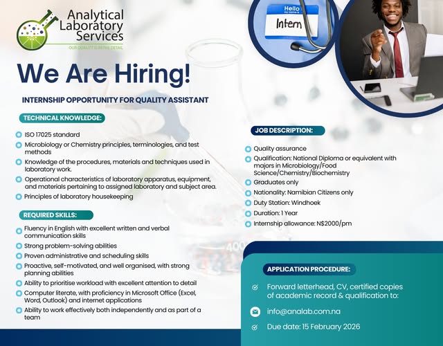 Apply for Internship, Quality Assistant and various job openings in Namibia. Submit your online application for Analytical Laboratory Services Namibia job opportunities through the recruitment portal at @analabnam.com. Our website provides a detailed step-by-step guide on how to apply for Analytical Laboratory Services Namibia job openings in Namibia. Stay informed with daily updates on the latest vacancy news and notices in Namibia.