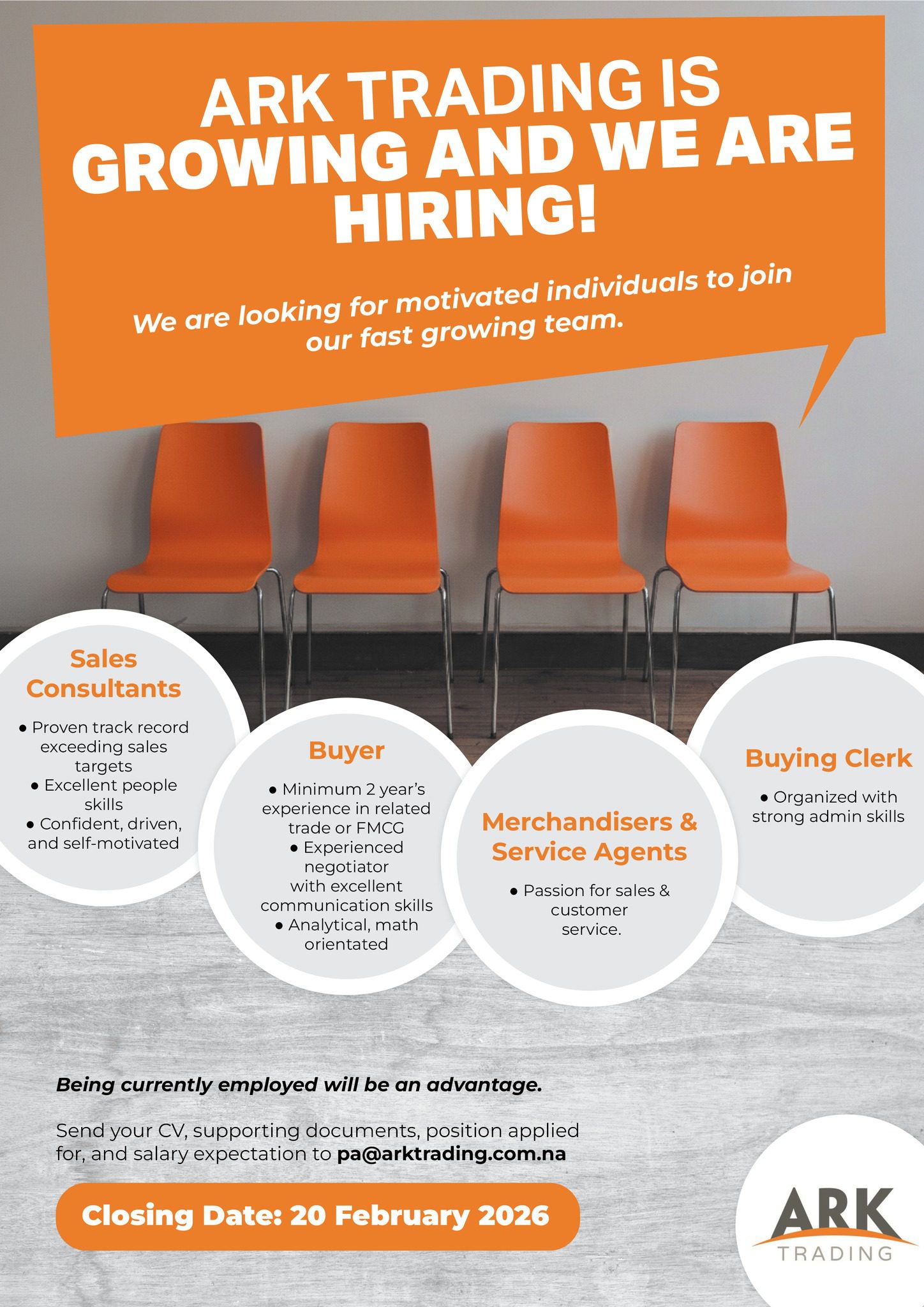 Discover the latest ARK Trading Vacancies for 2026! Apply for Sales Consultants, Buyer, Clerk, Merchandisers and various other positions through the @www.arktrading.com.na Job Portal. Start your application today and take the next step in your career!