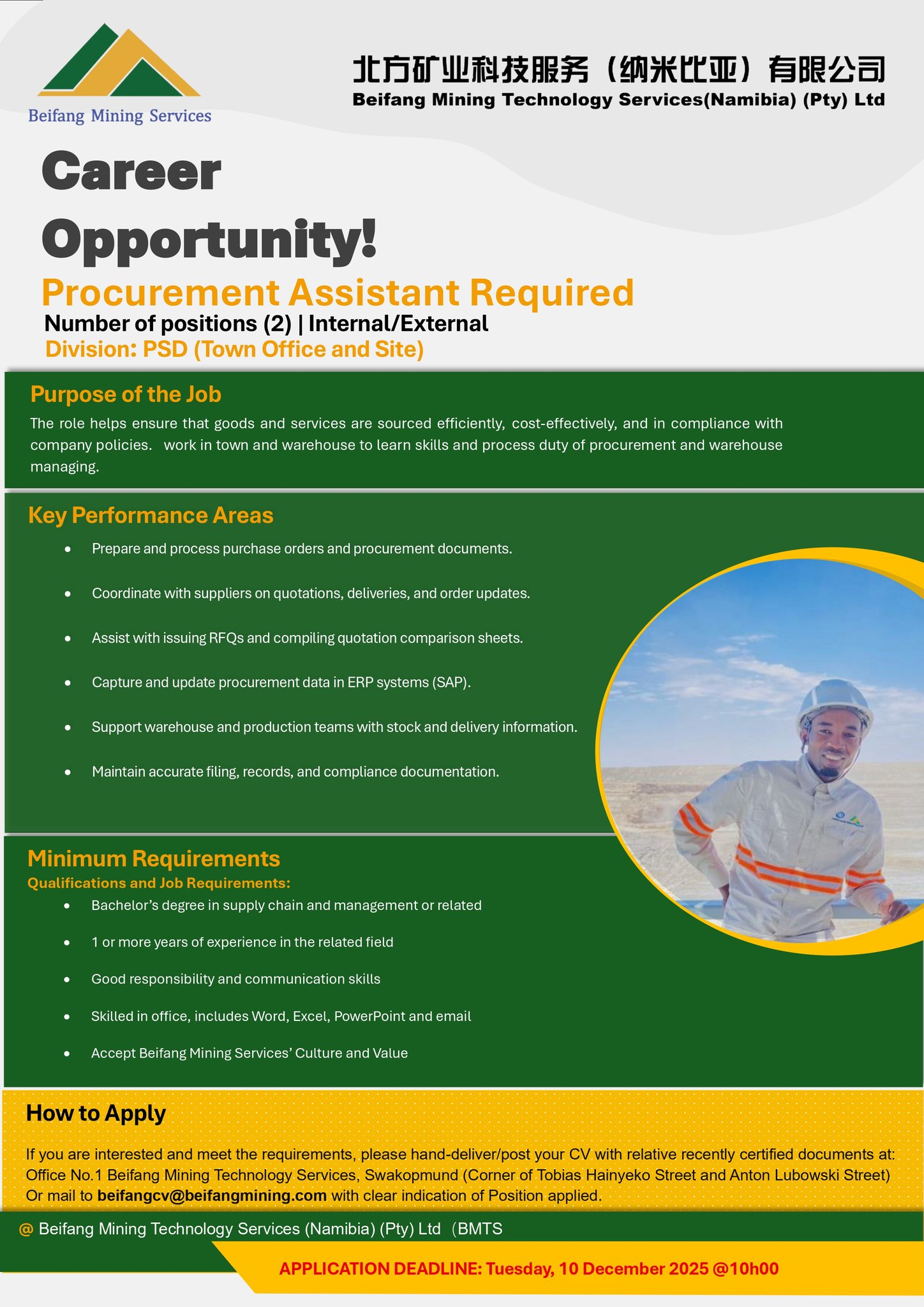 Namibian candidates seeking Beifang Mining Service job opportunities have come to the right place! This article offers detailed information on Procurement Officer, Procurement Assistant and various other job openings to help advance your career. For those interested in employment with the Namibian government and private companies, we provide up-to-date information on current Beifang Mining Service job openings. The Beifang Mining Service Vacancies Portal is known for frequently hiring for various government positions in Namibia, making it one of the most sought-after platforms. Additionally, you can download the Beifang Mining Service Application Form 2025 PDF for Namibian government jobs directly from our website. Start your career journey today!