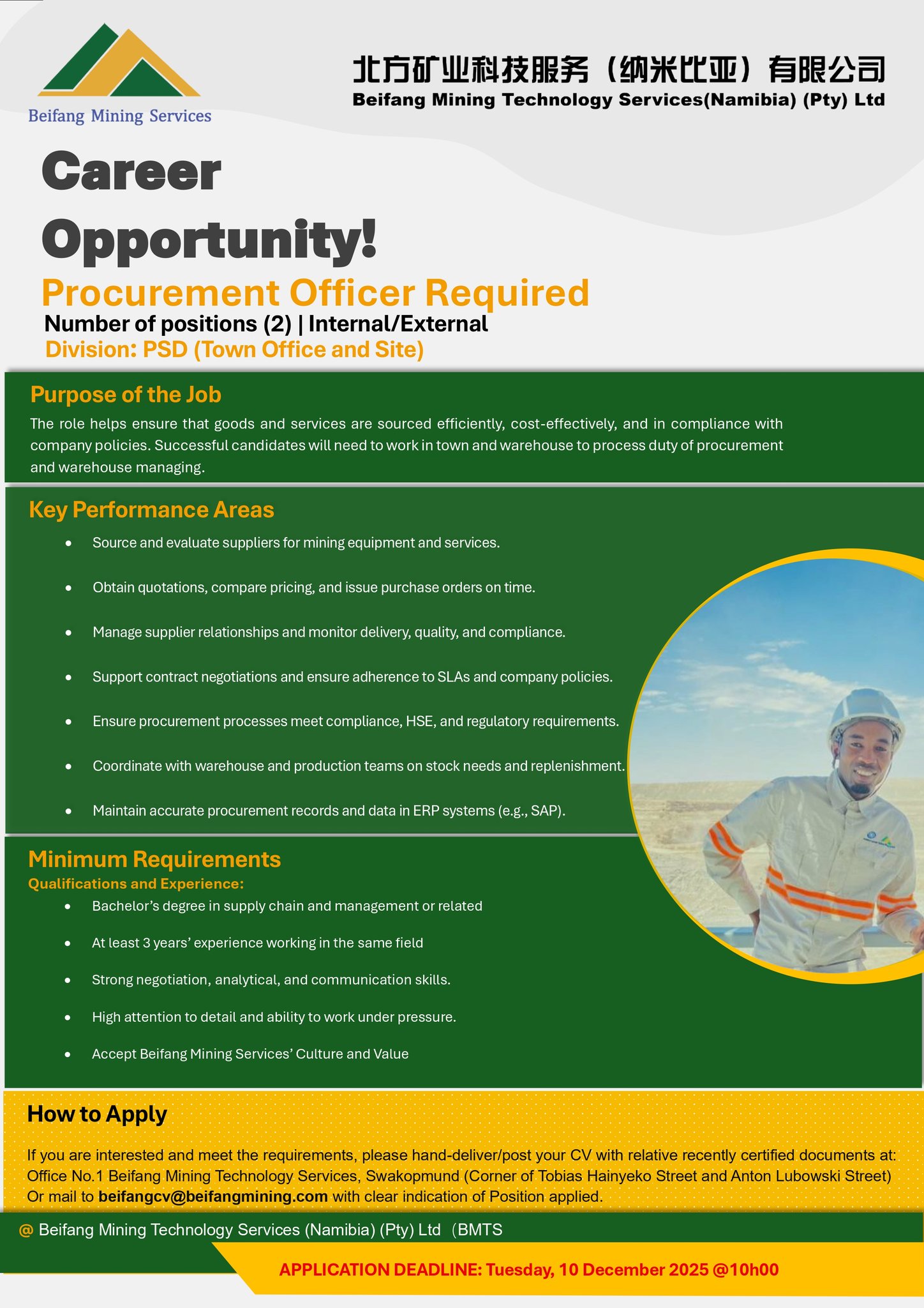 Discover the latest Beifang Mining Service Vacancies for 2025! Apply for Procurement Officer, Procurement Assistant and various other positions through the @www.beifangmining.com.na Job Portal. Start your application today and take the next step in your career!