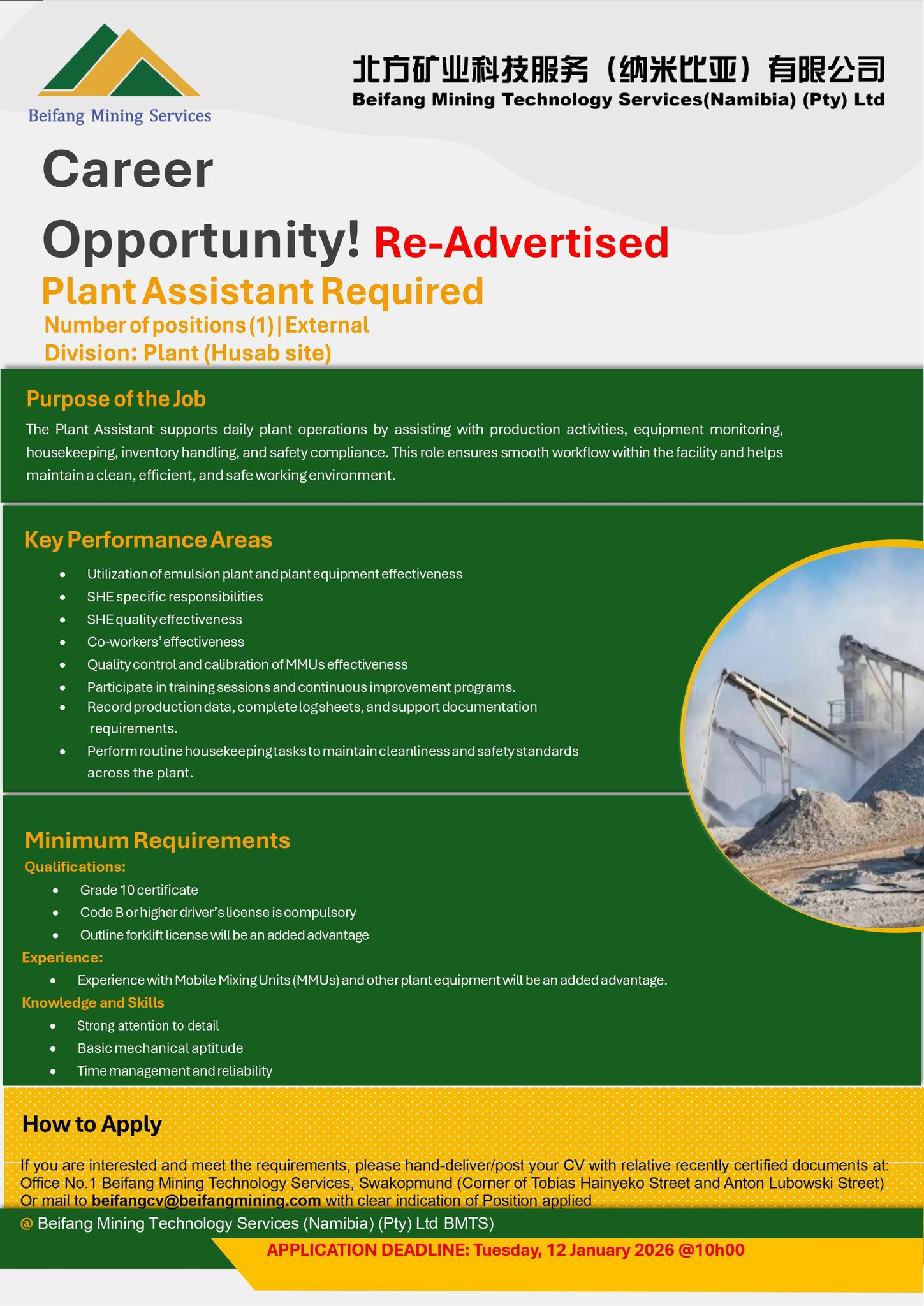 Apply for Plant Assistant, Track Dozer Operators and various job openings in Namibia. Submit your online application for Beifang Mining Service job opportunities through the recruitment portal at @www.beifangmining.com.na. Our website provides a detailed step-by-step guide on how to apply for Beifang Mining Service job openings in Namibia. Stay informed with daily updates on the latest vacancy news and notices in Namibia.