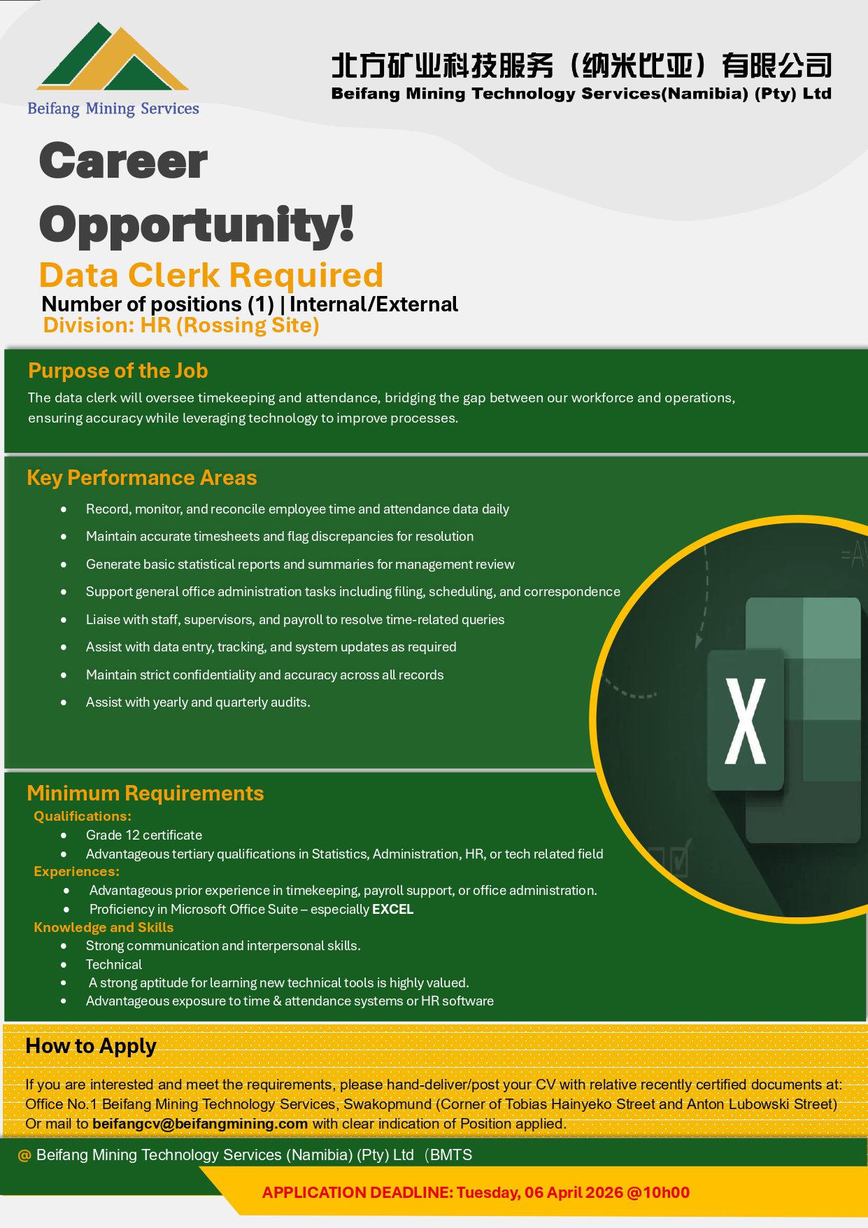 Namibian candidates seeking Beifang Mining Service job opportunities have come to the right place! This article offers detailed information on Storeman, Data Clerk and various other job openings to help advance your career. For those interested in employment with the Namibian government and private companies, we provide up-to-date information on current Beifang Mining Service job openings. The Beifang Mining Service Vacancies Portal is known for frequently hiring for various government positions in Namibia, making it one of the most sought-after platforms. Additionally, you can download the Beifang Mining Service Application Form 2026 PDF for Namibian government jobs directly from our website. Start your career journey today!
