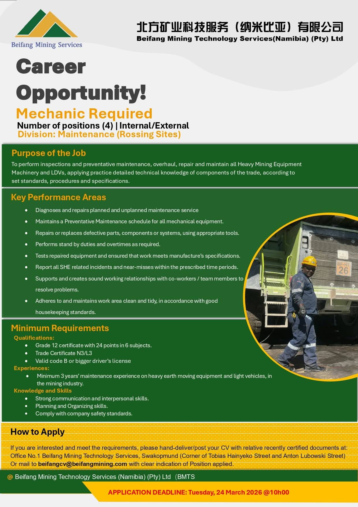 Apply for Mechanic, Auto Electricians and various job openings in Namibia. Submit your online application for Beifang Mining Service job opportunities through the recruitment portal at @www.beifangmining.com.na. Our website provides a detailed step-by-step guide on how to apply for Beifang Mining Service job openings in Namibia. Stay informed with daily updates on the latest vacancy news and notices in Namibia.