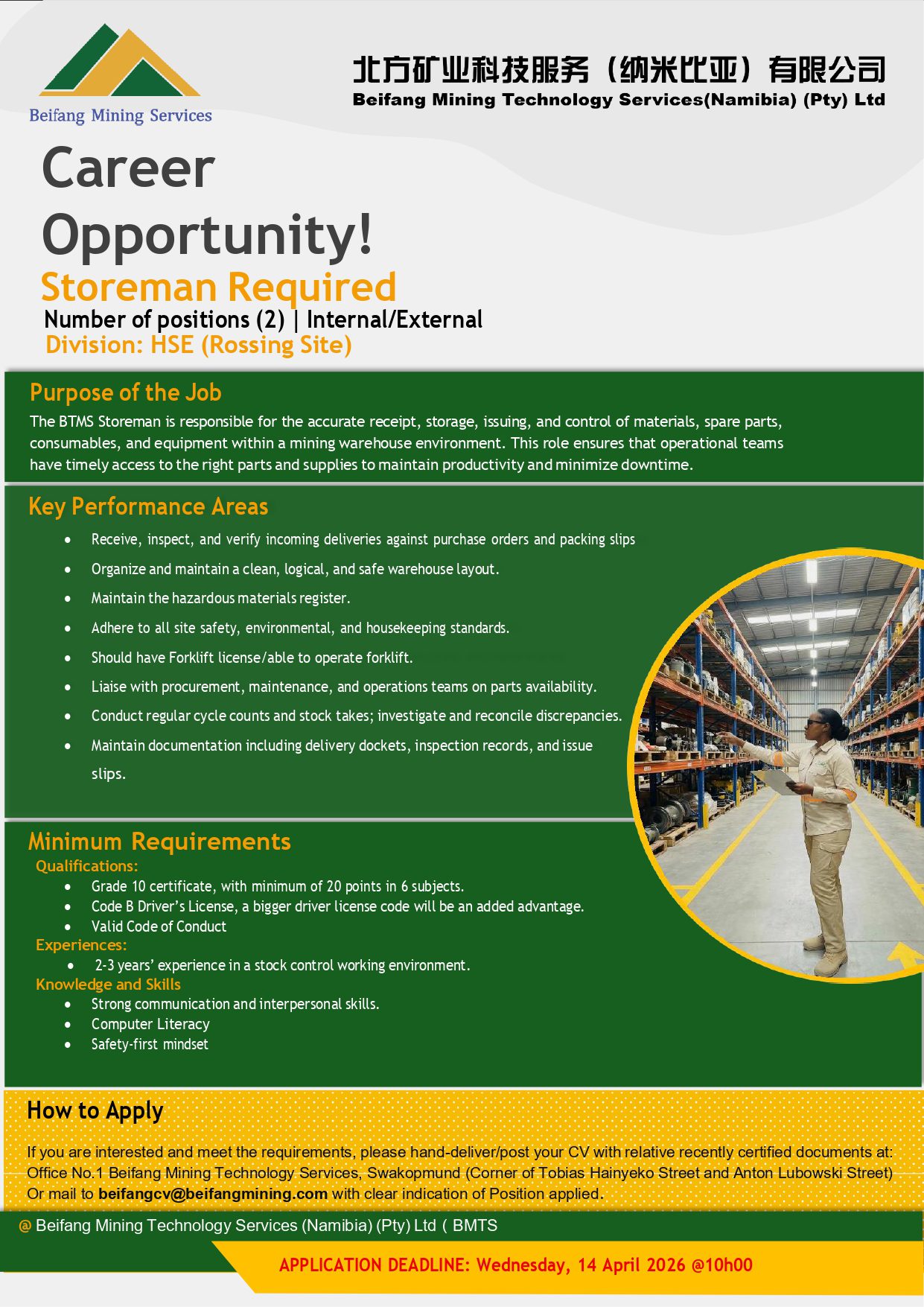 Apply for Storeman, Data Clerk and various job openings in Namibia. Submit your online application for Beifang Mining Service job opportunities through the recruitment portal at @www.beifangmining.com.na. Our website provides a detailed step-by-step guide on how to apply for Beifang Mining Service job openings in Namibia. Stay informed with daily updates on the latest vacancy news and notices in Namibia.