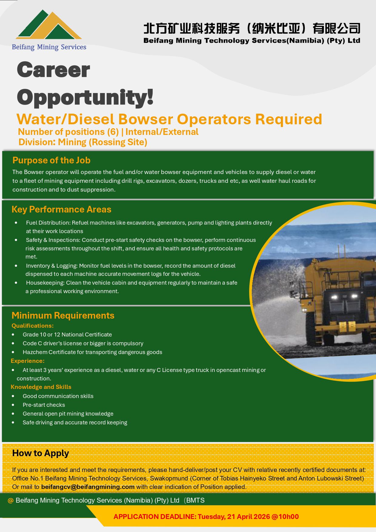 The Beifang Mining Service Career Portal has announced a new batch of high-demand job openings today. You can apply based on your qualifications using the links provided on the page! Explore these exciting opportunities now on the Beifang Mining Service Careers Portal at @www.beifangmining.com.na. Start your journey today with Beifang Mining Service Vacancies. Positions are available in Windhoek, Swakopmund, Walvis Bay, Okahandja, Otjiwarongo, Rundu, and other cities across Namibia. Stay updated with the latest job openings in Namibia for 2026