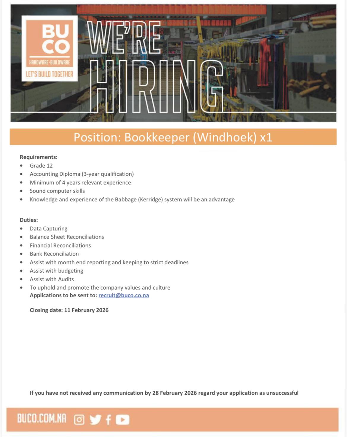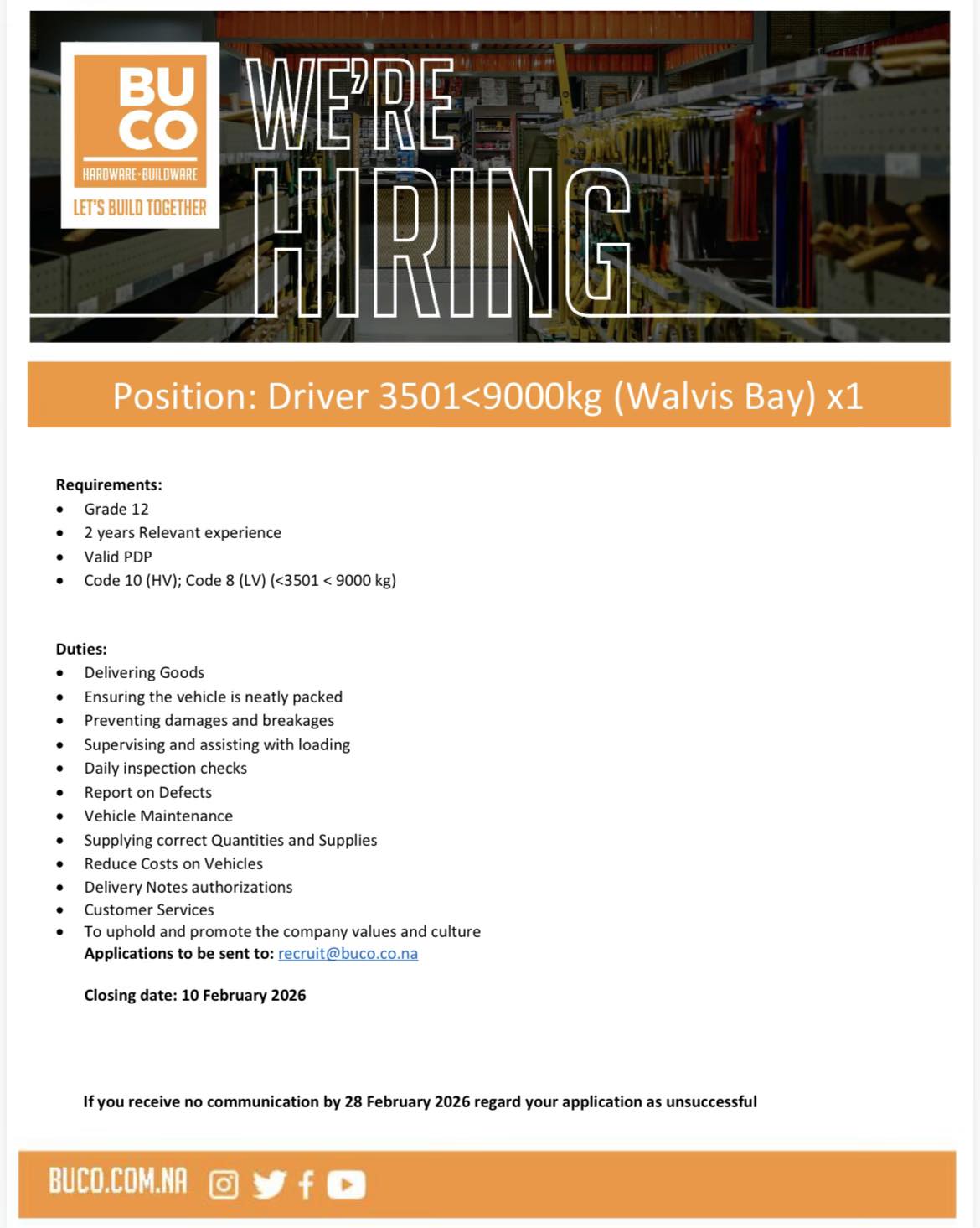 | π’ Hiring Hardware Store: | BUCO Windhoek Vacancies 2026 |