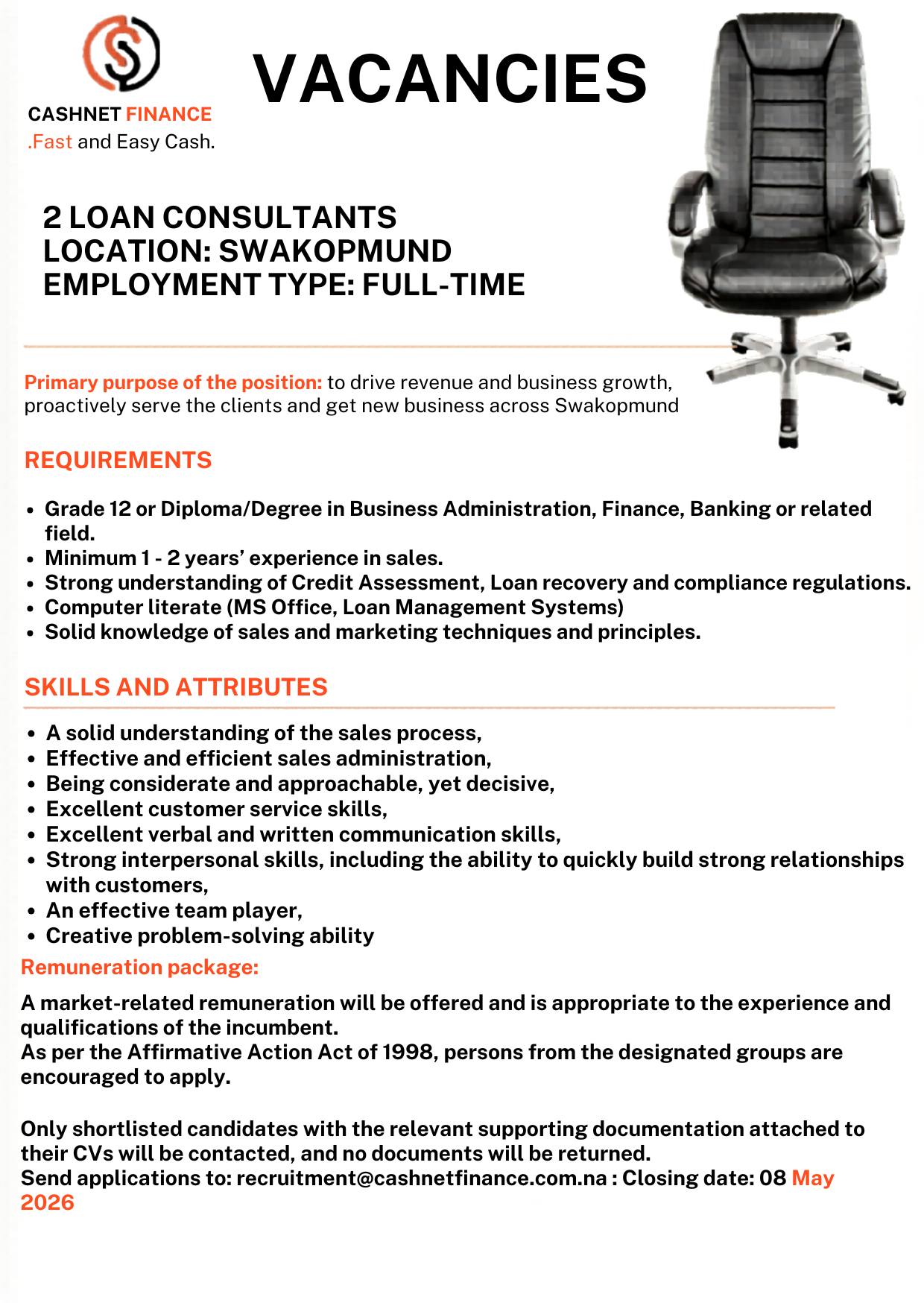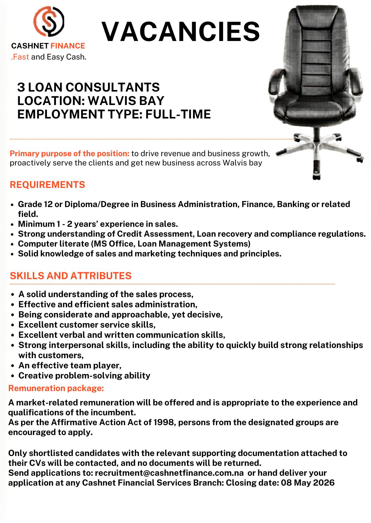 | 📢 Hiring Organization: | Cashnet Finance Namibia Vacancies |