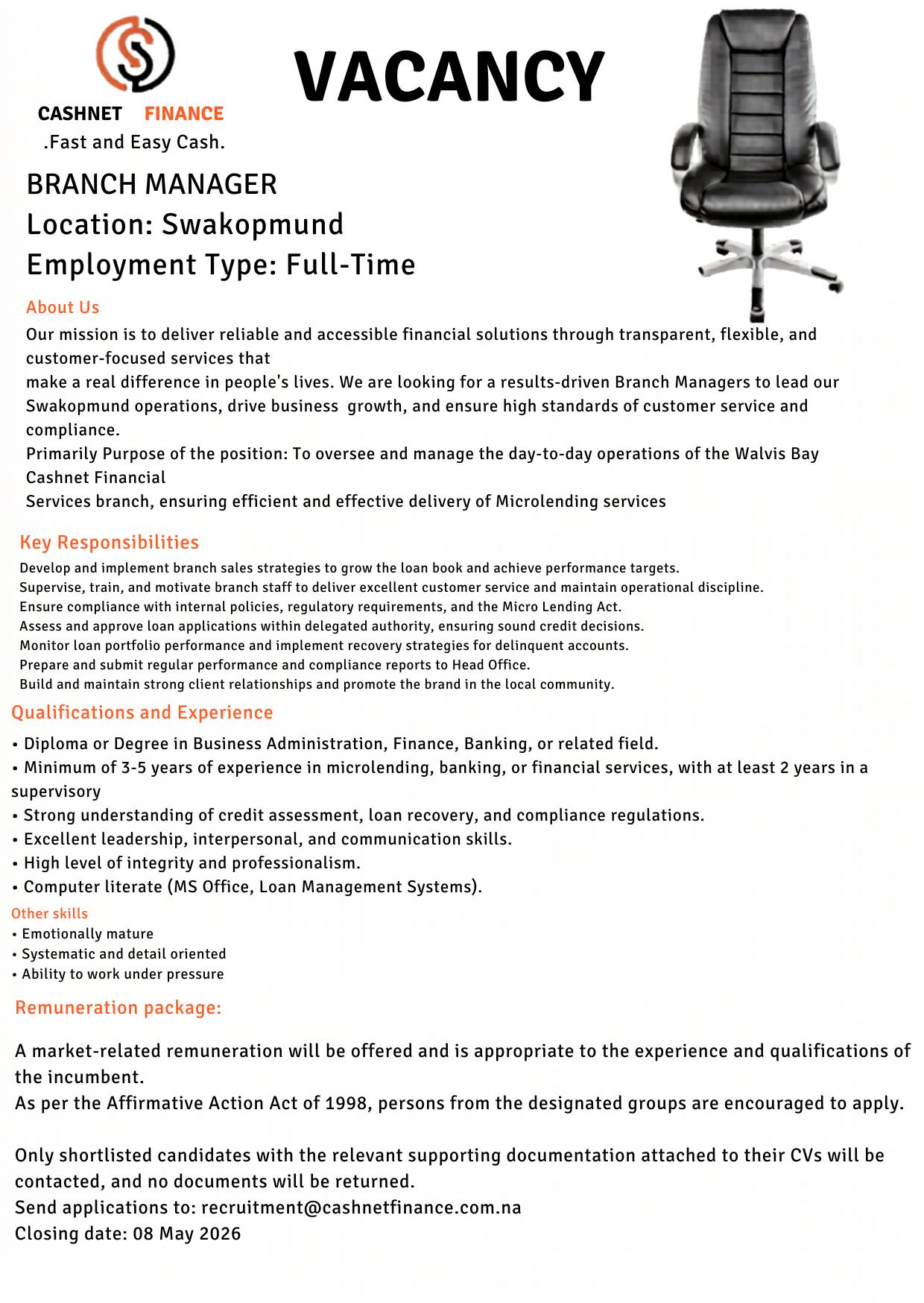 Apply for Branch Manager, Loan Consultants and various job openings in Namibia. Submit your online application for Cashnet Finance job opportunities through the recruitment portal at (www.cashnetfinance.com.na). A simple step-by-step application guide is available to help you complete the process correctly.