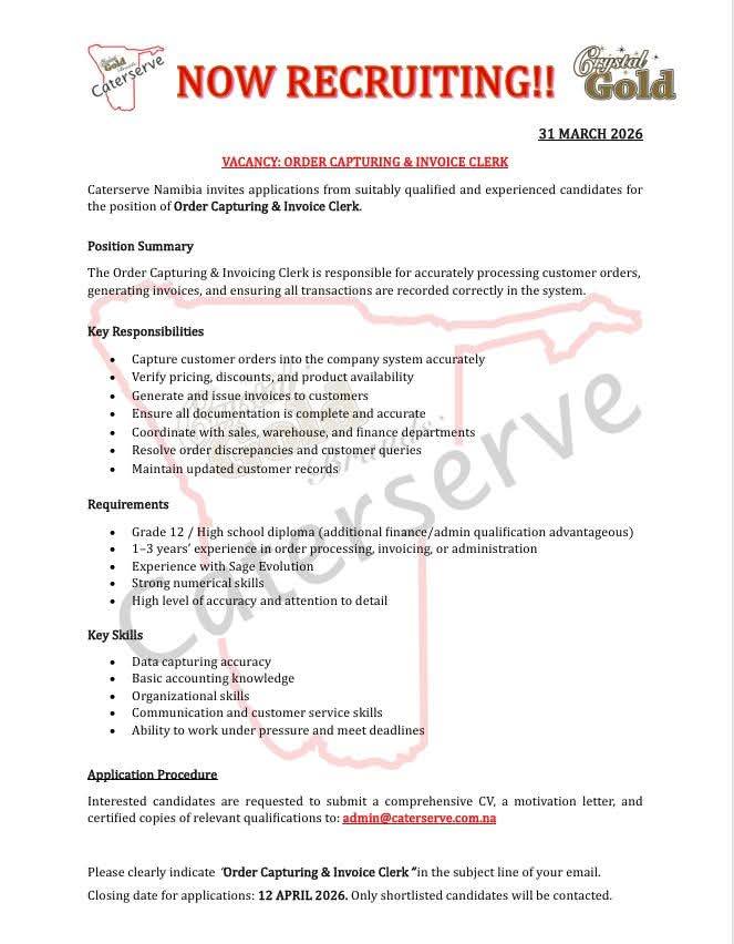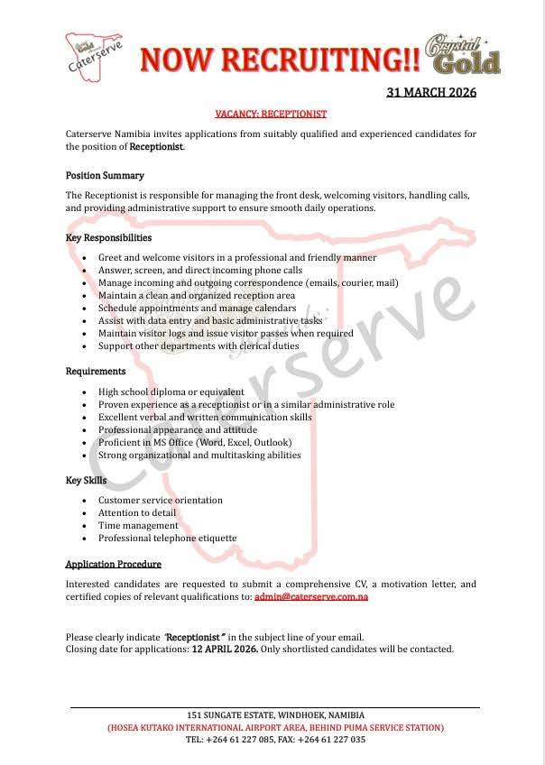 Discover the latest Caterserve Namibia Vacancies for 2026! Apply for Receptionist, Clerk and various other positions through the @www.caterserve.com.na Job Portal. Start your application today and take the next step in your career!