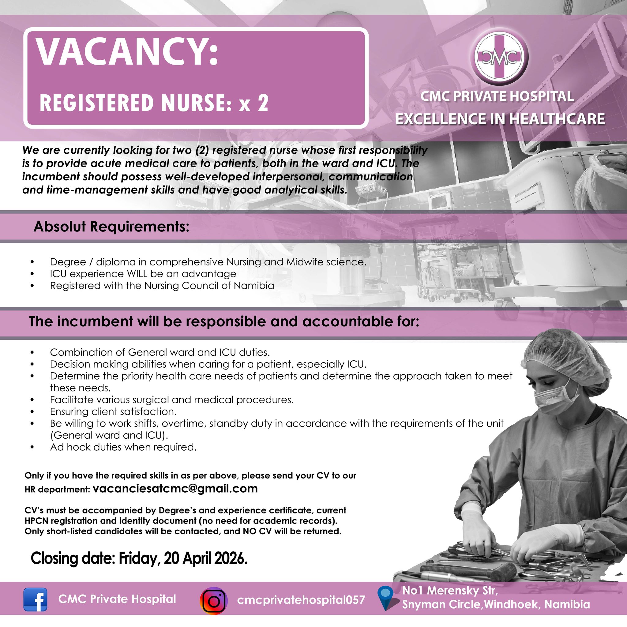 Apply for Registered Nurse and various job openings in Namibia. Submit your online application for CMC Private Hospital job opportunities through the recruitment portal at (www.cmcprivatehospital.com.na). A simple step-by-step application guide is available to help you complete the process correctly.