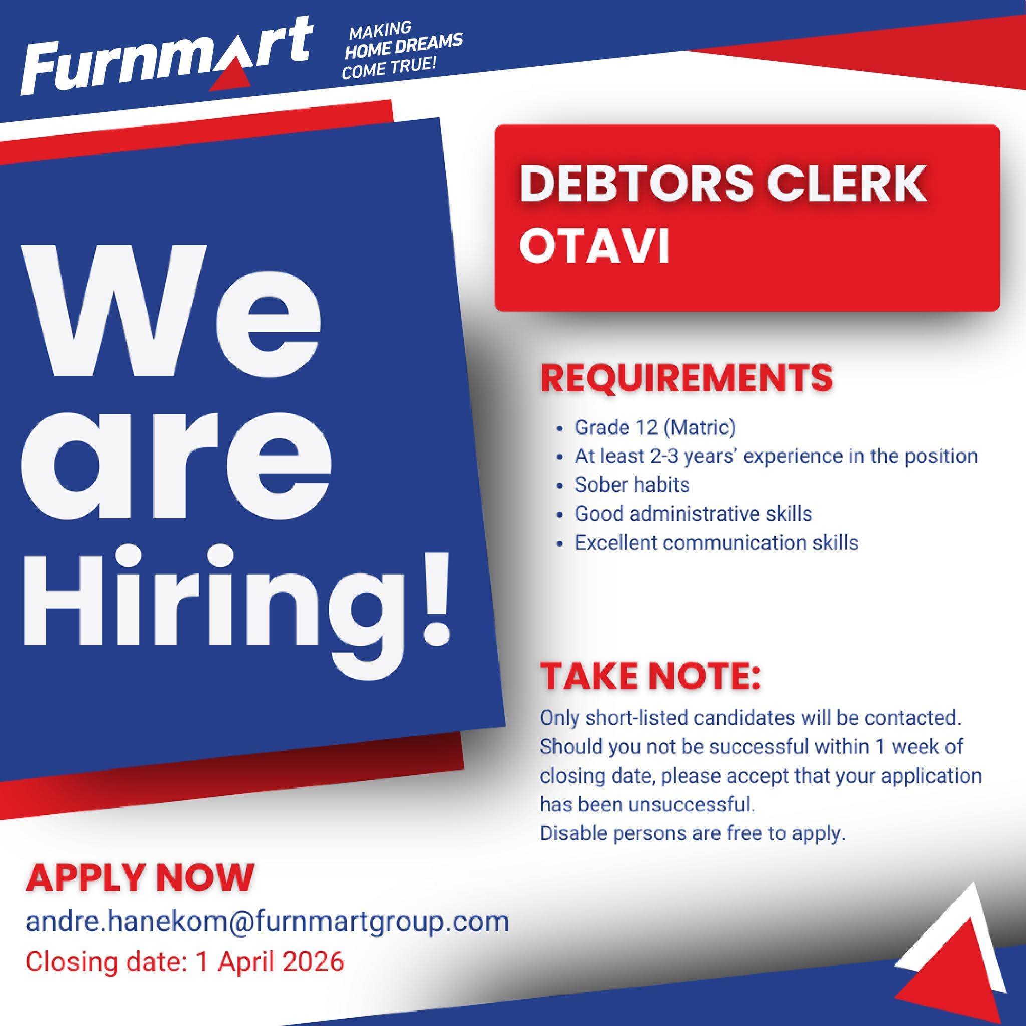 Discover the latest Furnmart Vacancies for 2026! Apply for Debtors Clerk, Trainee Manager and various other positions through the @www.furnmart.com.na Job Portal. Start your application today and take the next step in your career!
