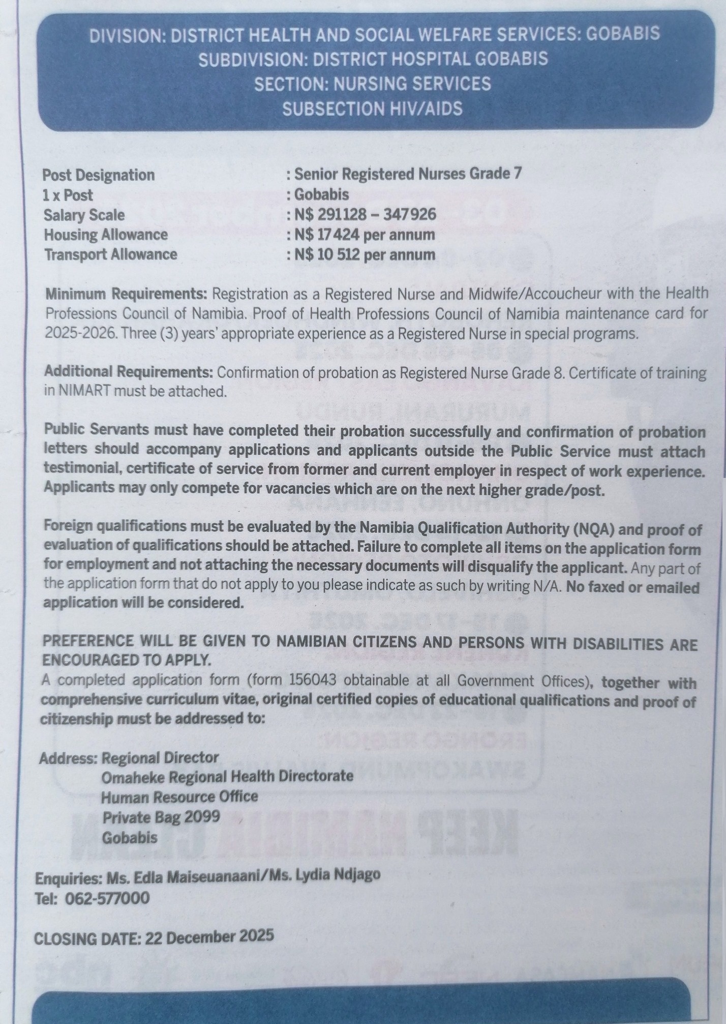 Apply for Senior Registered Nurses and various job openings in Namibia. Submit your online application for Gobabis Municipality job opportunities through the recruitment portal at @www.gobabis.org. Our website provides a detailed step-by-step guide on how to apply for Gobabis Municipality job openings in Namibia π³π¦. Stay informed with daily updates on the latest vacancy news and notices in Namibia π³π¦.