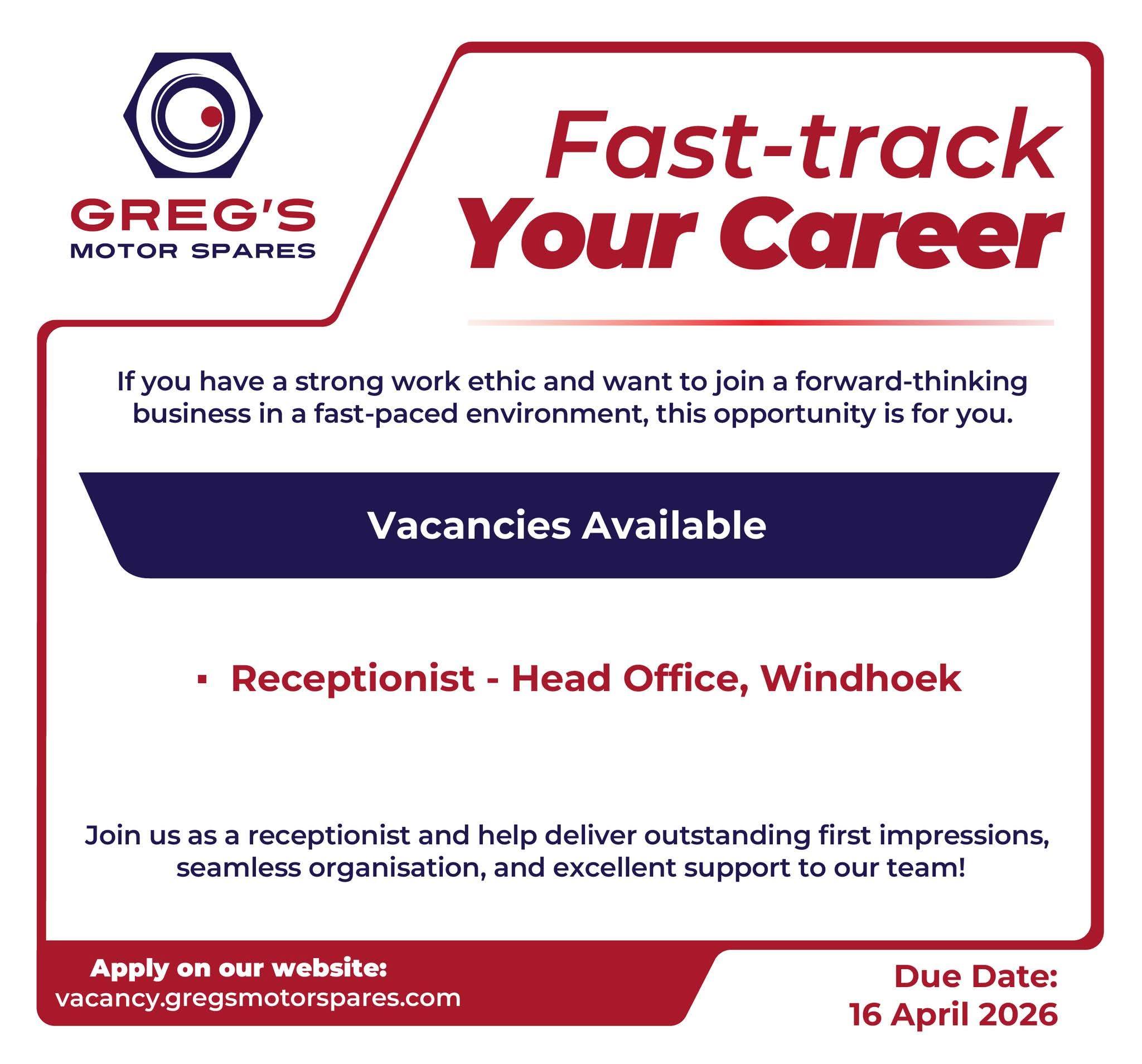 The Greg’s Motor Spares Career Portal has recently published new job openings across different roles and locations. Candidates can apply for latest job opportunities in Namibia through the official recruitment portal based on their qualifications and experience. You can explore available opportunities through the official careers portal and follow the application steps carefully. This is a great opportunity to explore high paying jobs in Namibia and build a strong professional career with Greg’s Motor Spares. Job positions are available in Windhoek, Swakopmund, Walvis Bay, Okahandja, Otjiwarongo, Rundu, and other locations across Namibia. You can explore latest job vacancies, salary details, and career opportunities in Namibia all in one place.