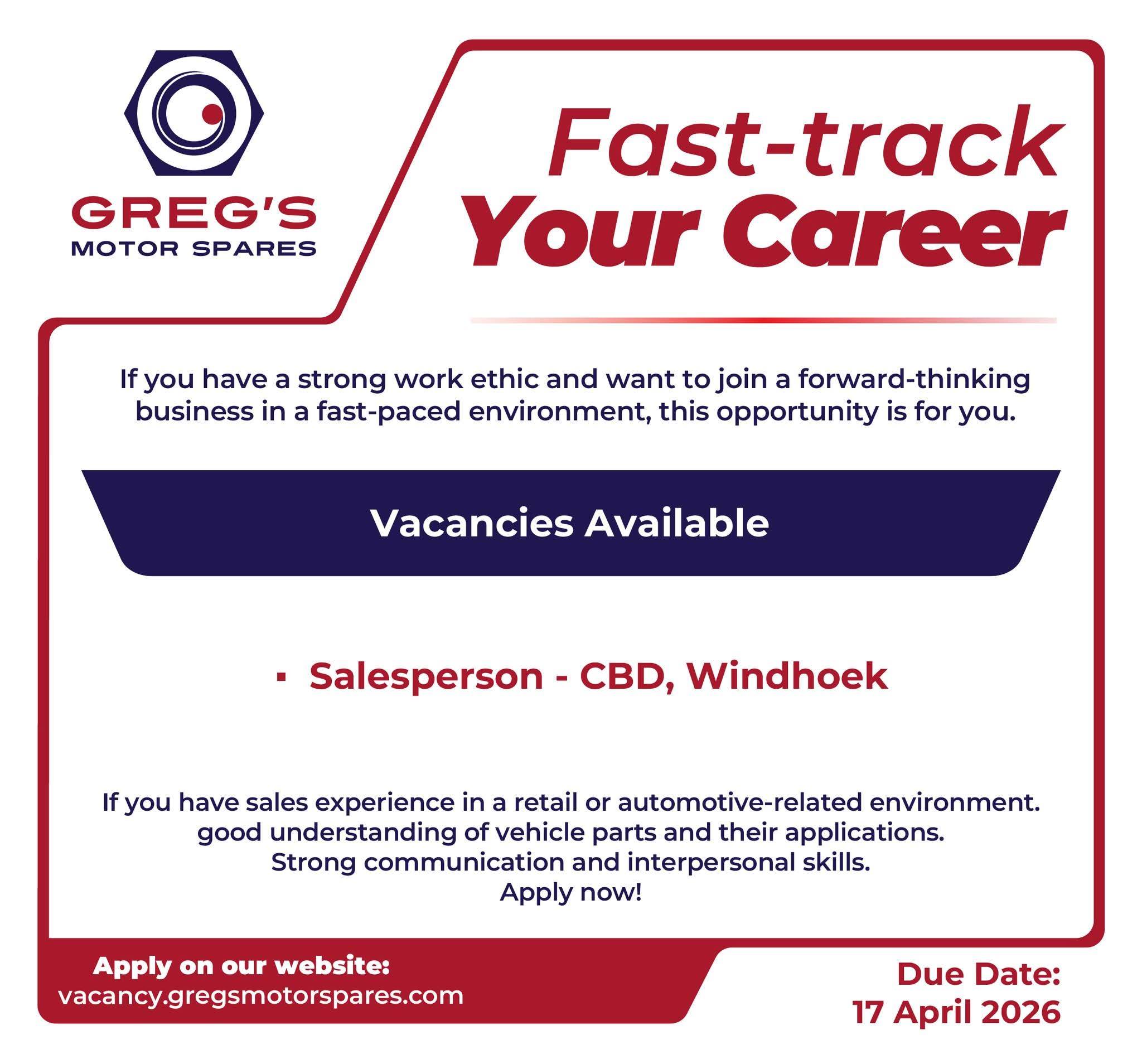 Apply for Salesperson, Receptionist and various job openings in Namibia. Submit your online application for Greg’s Motor Spares job opportunities through the recruitment portal at (www.gregsmotorspares.com). A simple step-by-step application guide is available to help you complete the process correctly.