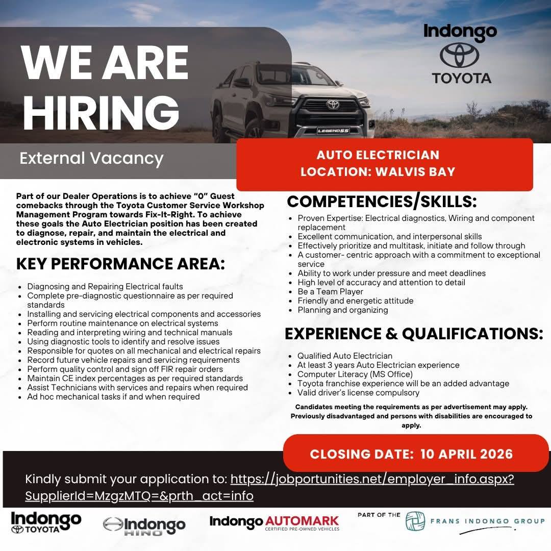 Namibian candidates seeking Indongo Motors job opportunities have come to the right place! This article offers detailed information on Auto Electrician, Advisor, Parts Manager, Supervisor, Clerk and various other job openings to help advance your career. For those interested in employment with the Namibian government and private companies, we provide up-to-date information on current Indongo Motors job openings. The Indongo Motors Vacancies Portal is known for frequently hiring for various government positions in Namibia, making it one of the most sought-after platforms. Additionally, you can download the Indongo Motors Application Form 2026 PDF for Namibian government jobs directly from our website. Start your career journey today!