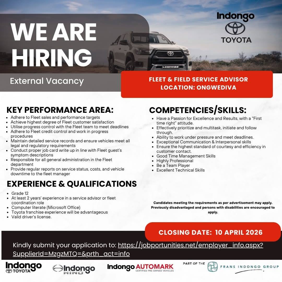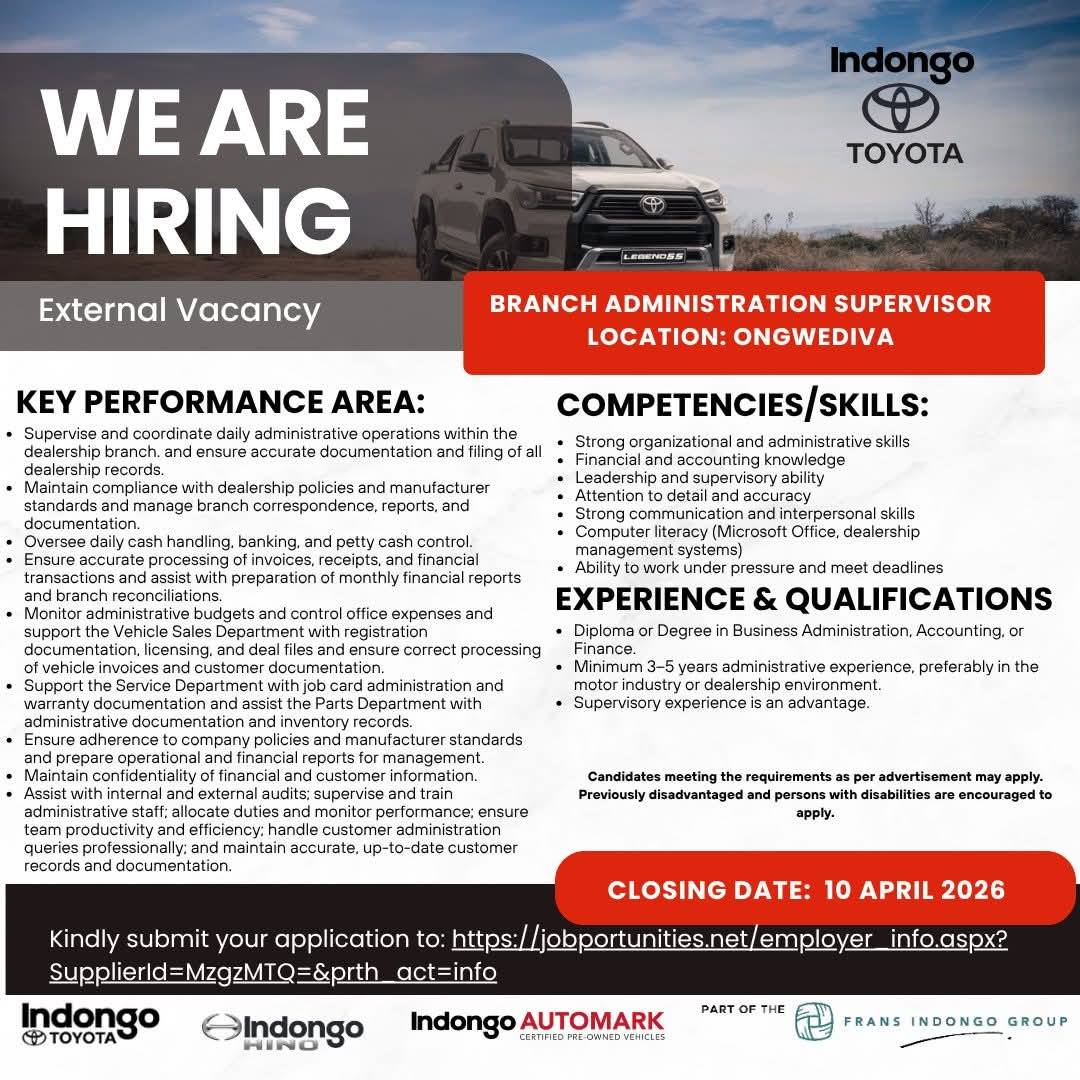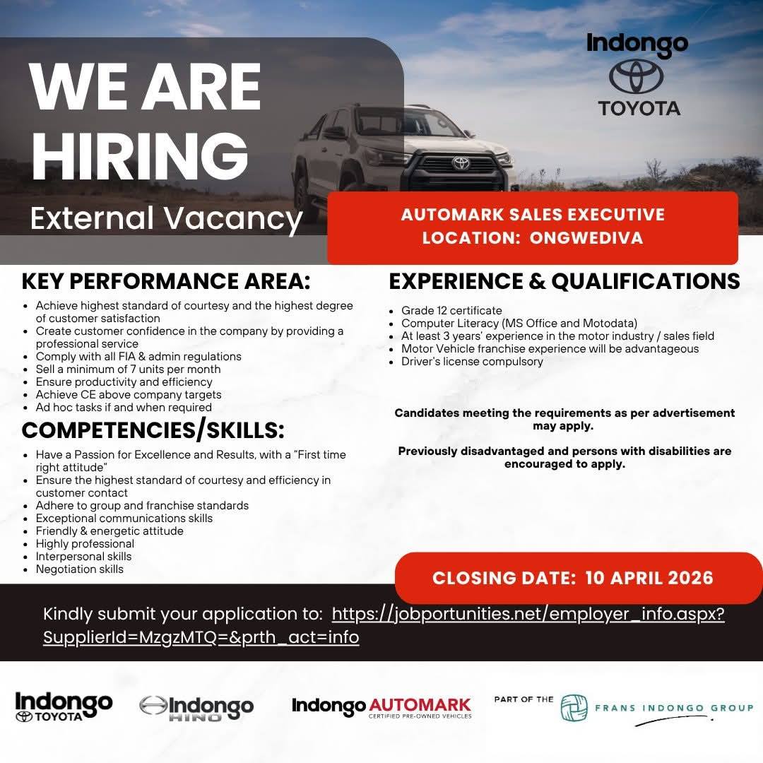 The Indongo Motors Career Portal has announced a new batch of high-demand job openings today. You can apply based on your qualifications using the links provided on the page! Explore these exciting opportunities now on the Indongo Motors Careers Portal at @www.indongomotorsgroup.com. Start your journey today with Indongo Motors Vacancies. Positions are available in Windhoek, Swakopmund, Walvis Bay, Okahandja, Otjiwarongo, Rundu, and other cities across Namibia. Stay updated with the latest job openings in Namibia for 2026