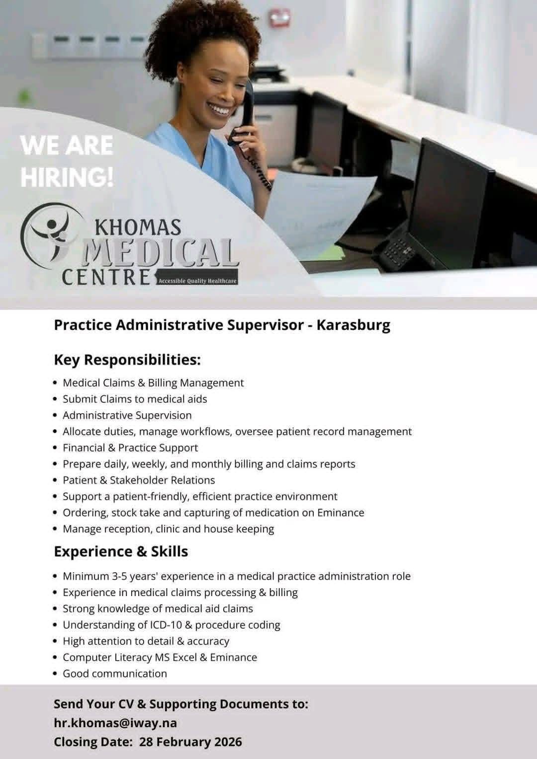 Namibian candidates seeking Khomas Medical Centre job opportunities have come to the right place! This article offers detailed information on Practice Administrative Supervisor, Registered Nurse and various other job openings to help advance your career. For those interested in employment with the Namibian government and private companies, we provide up-to-date information on current Khomas Medical Centre job openings. The Khomas Medical Centre Vacancies Portal is known for frequently hiring for various government positions in Namibia, making it one of the most sought-after platforms. Additionally, you can download the Khomas Medical Centre Application Form 2026 PDF for Namibian government jobs directly from our website. Start your career journey today!
