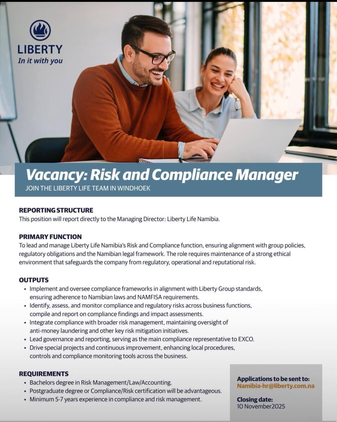 Namibian candidates seeking Liberty Life Namibia job opportunities have come to the right place! This article offers detailed information on Risk And Compliance Manager and various other job openings to help advance your career. For those interested in employment with the Namibian government and private companies, we provide up-to-date information on current Liberty Life Namibia job openings. The Liberty Life Namibia Vacancies Portal is known for frequently hiring for various government positions in Namibia, making it one of the most sought-after platforms. Additionally, you can download the Liberty Life Namibia Application Form 2025 PDF for Namibian government jobs directly from our website. Start your career journey today!