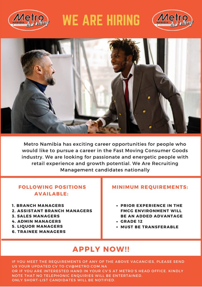 Apply for Sales Managers, Admin Managers, Trainee Managers, Assistant Branch Managers and various job openings in Namibia. Submit your online application for Metro Namibia job opportunities through the recruitment portal at @www.metro.com.na. Our website provides a detailed step-by-step guide on how to apply for Metro Namibia job openings in Namibia. Stay informed with daily updates on the latest vacancy news and notices in Namibia.