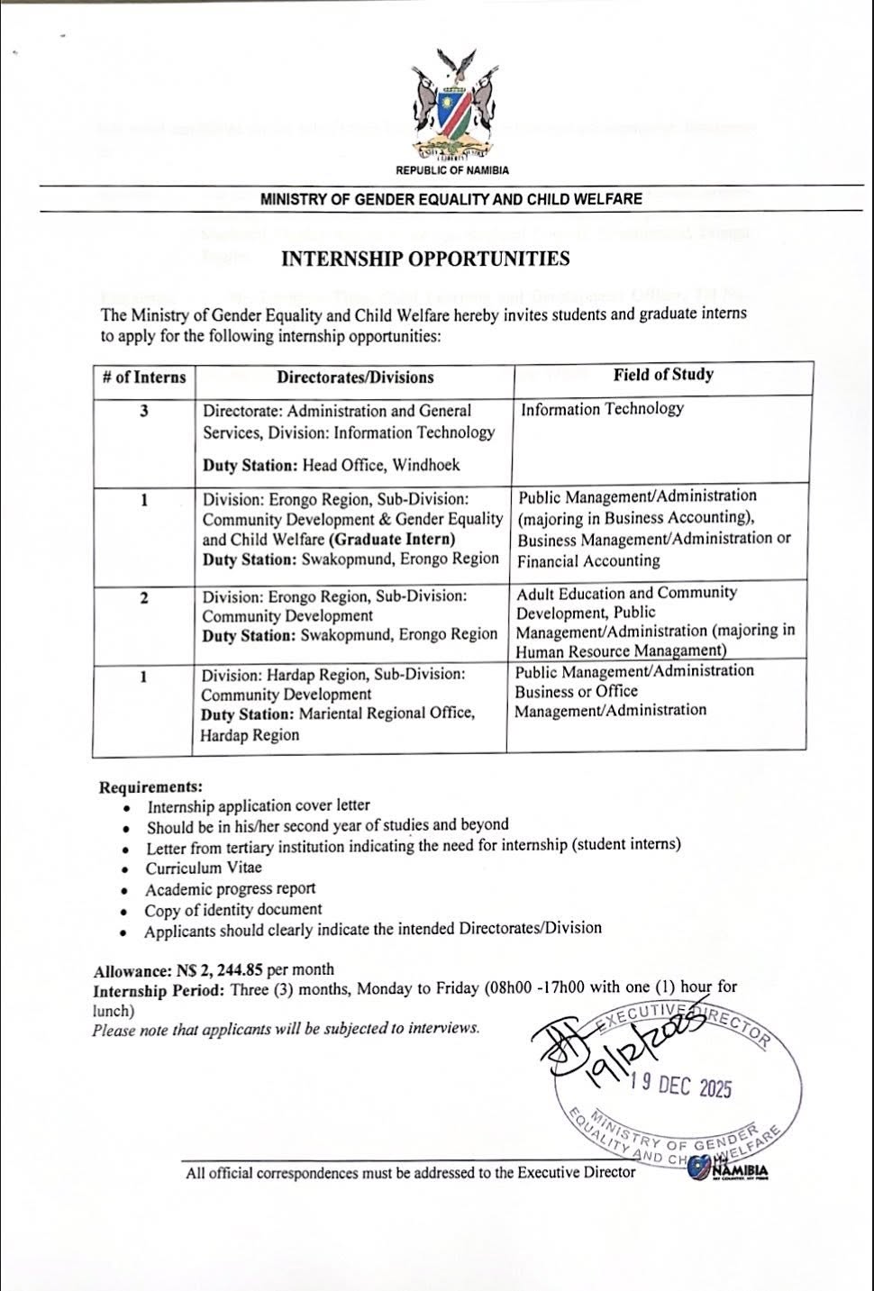 Apply for Internship, Social Worker and various job openings in Namibia. Submit your online application for MGECW job opportunities through the recruitment portal at @mgecw.gov.na. Our website provides a detailed step-by-step guide on how to apply for MGECW job openings in Namibia π³π¦. Stay informed with daily updates on the latest vacancy news and notices in Namibia π³π¦.