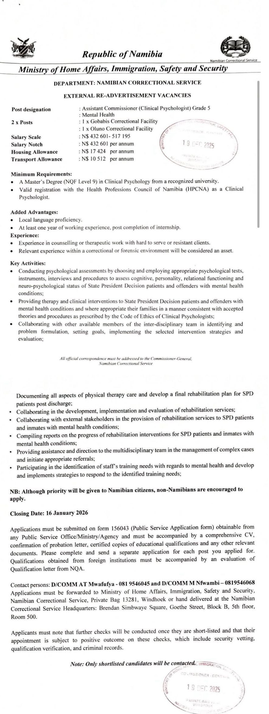Apply for Assistant Commissioner, Recruit and various job openings in Namibia. Submit your online application for MHA job opportunities through the recruitment portal at @mha.gov.na. Our website provides a detailed step-by-step guide on how to apply for MHA job openings in Namibia. Stay informed with daily updates on the latest vacancy news and notices in Namibia.
