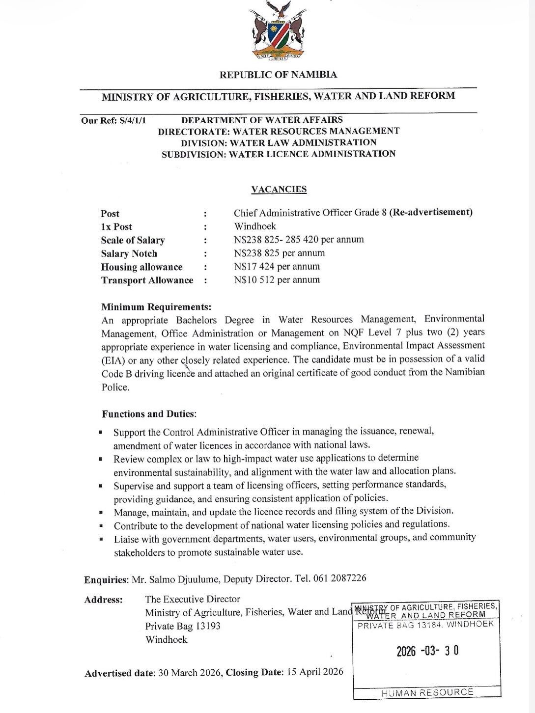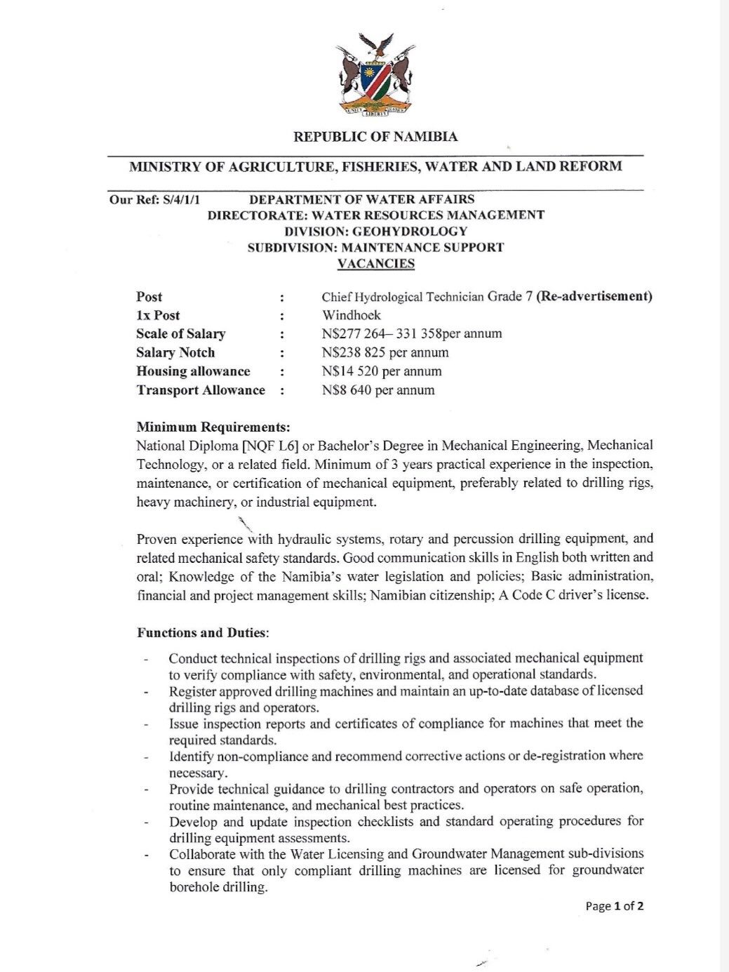 | 📢 Hiring Organization: | Ministry of Agriculture, Water and Land Reform Vacancies Namibia |
