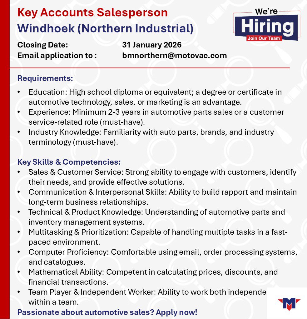 Namibian candidates seeking Motovac Namibia job opportunities have come to the right place! This article offers detailed information on Warehouse Supervisor, Sales Associate, Key Accounts Salesperson and various other job openings to help advance your career. For those interested in employment with the Namibian government and private companies, we provide up-to-date information on current Motovac Namibia job openings. The Motovac Namibia Vacancies Portal is known for frequently hiring for various government positions in Namibia, making it one of the most sought-after platforms. Additionally, you can download the Motovac Namibia Application Form 2026 PDF for Namibian government jobs directly from our website. Start your career journey today!