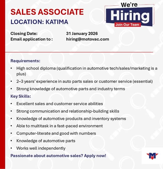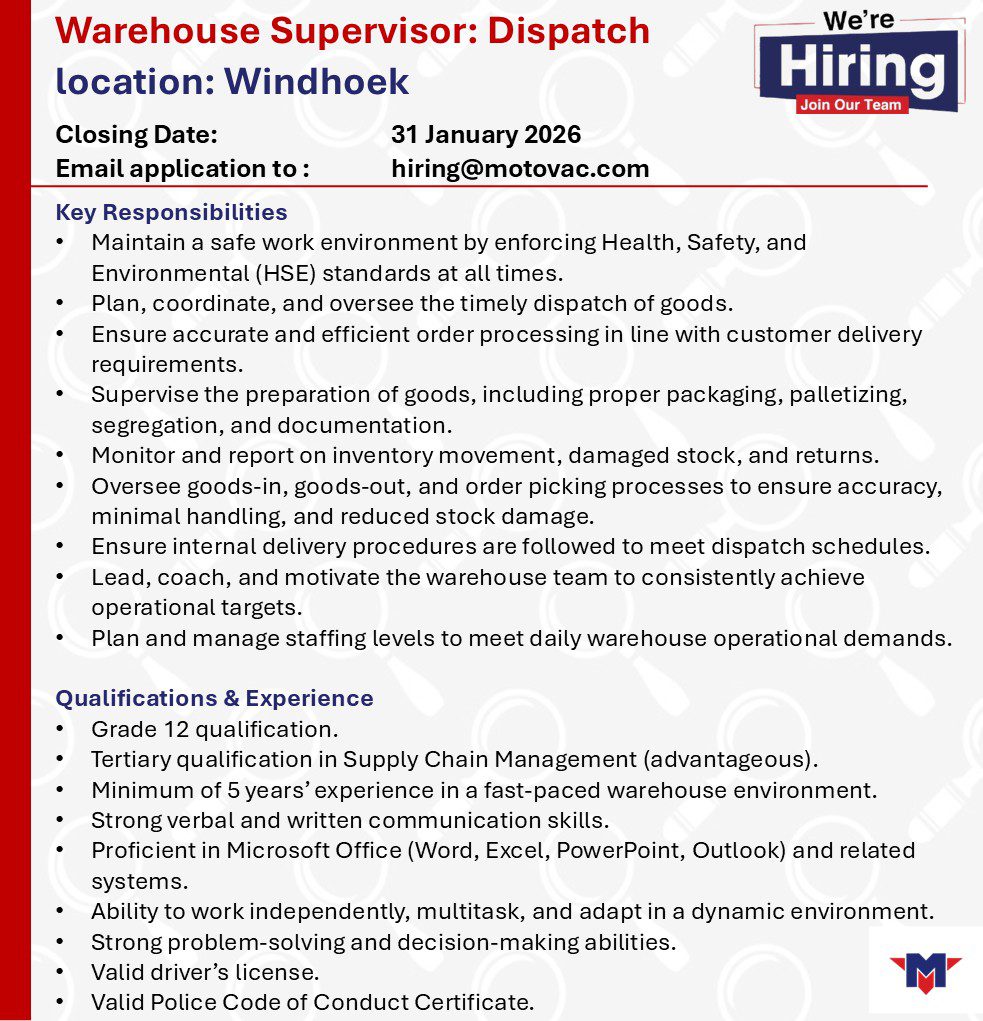 Apply for Warehouse Supervisor, Sales Associate, Key Accounts Salesperson and various job openings in Namibia. Submit your online application for Motovac Namibia job opportunities through the recruitment portal at @motovac.com. Our website provides a detailed step-by-step guide on how to apply for Motovac Namibia job openings in Namibia. Stay informed with daily updates on the latest vacancy news and notices in Namibia.