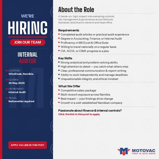 Apply for Internal Auditor and various job openings in Namibia. Submit your online application for Motovac job opportunities through the recruitment portal at (www.motovac.com). A simple step-by-step application guide is available to help you complete the process correctly.