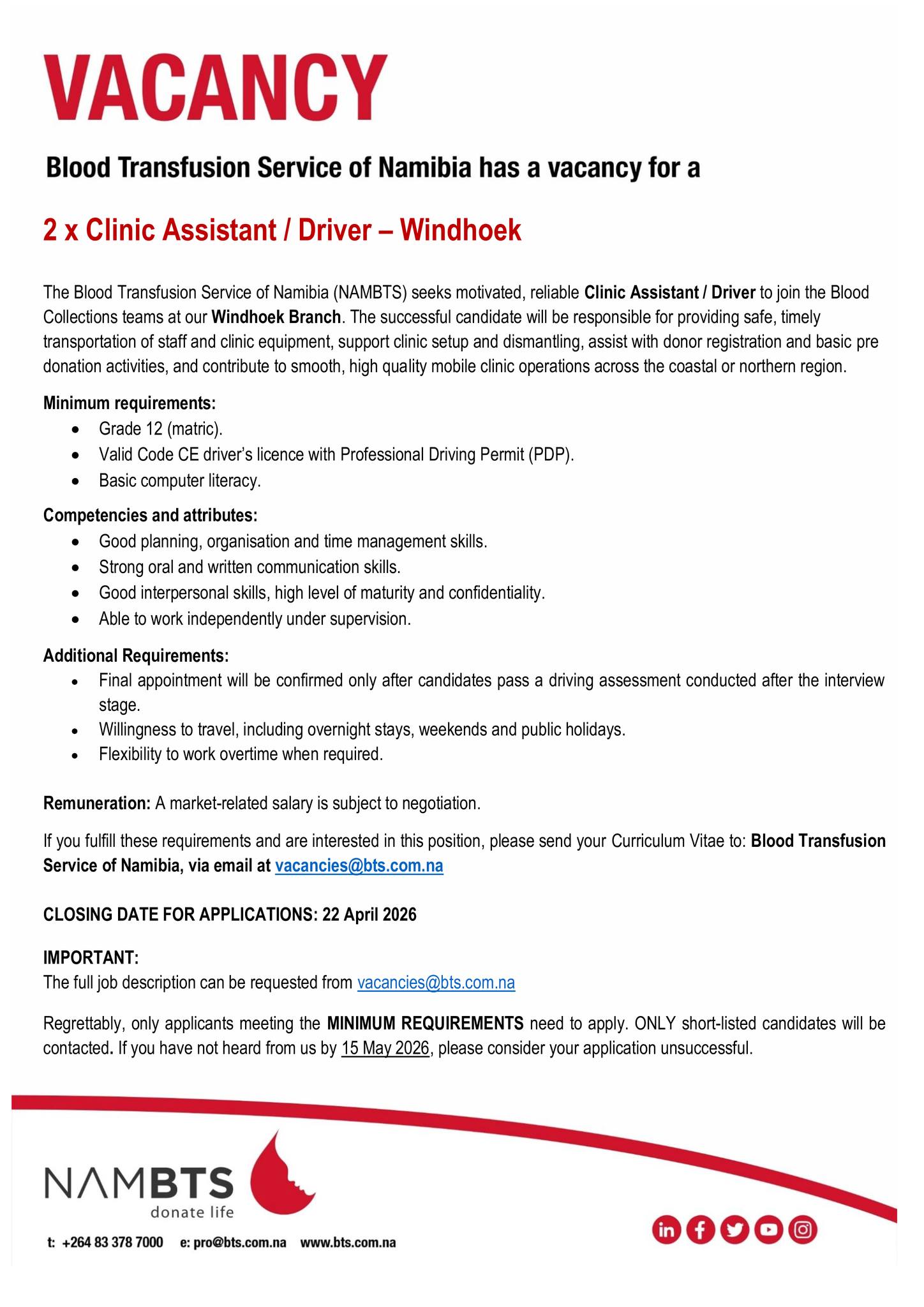 Apply for Marketing Officer, Medical Technologist, Driver, Enrolled Nurse and various job openings in Namibia. Submit your online application for NamBTS job opportunities through the recruitment portal at @www.bts.com.na. Our website provides a detailed step-by-step guide on how to apply for NamBTS job openings in Namibia. Stay informed with daily updates on the latest vacancy news and notices in Namibia.