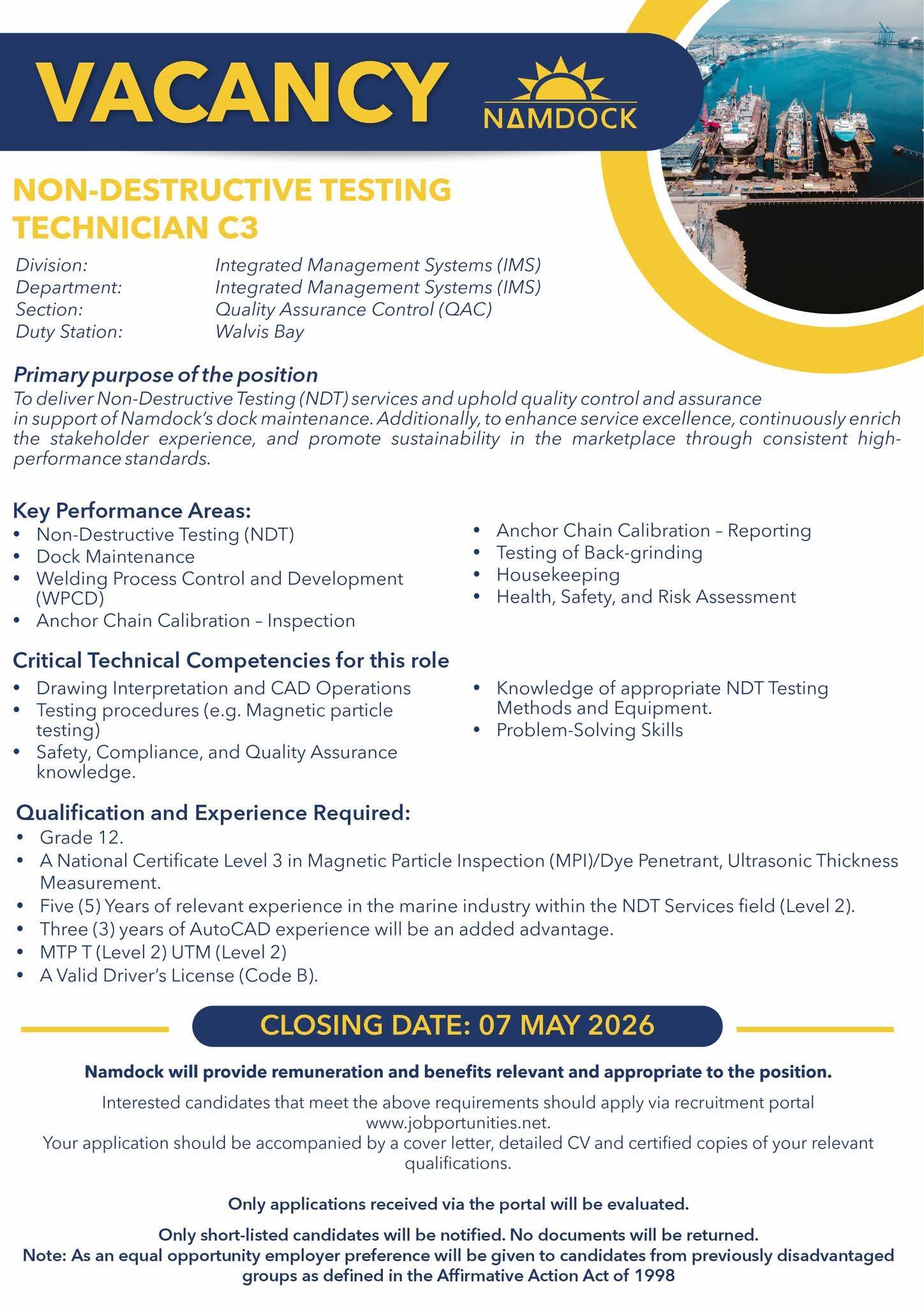 | Job Location: | Walvis Bay, Erongo & other regions in Namibia |