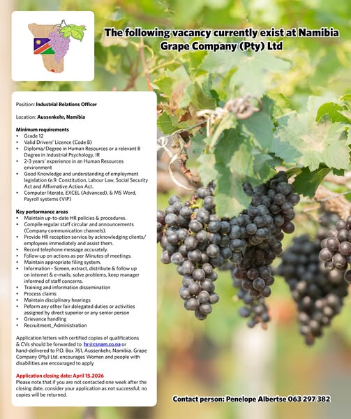Apply for Industrial Relations Officer and various job openings in Namibia. Submit your online application for Namibia Grape Company job opportunities through the recruitment portal at (www.namibiagrapecompany.com). A simple step-by-step application guide is available to help you complete the process correctly.