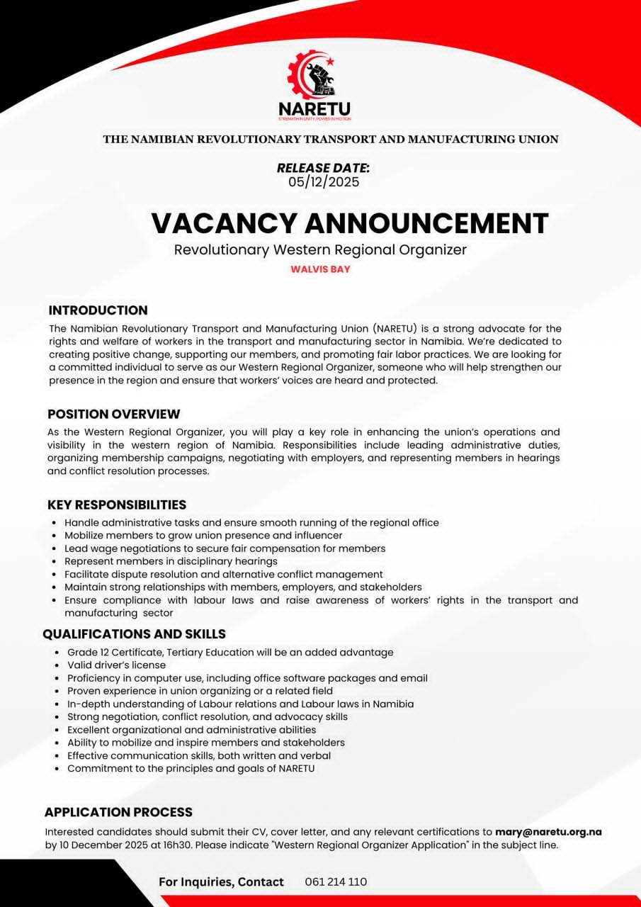 | π’ Hiring Labor Union: | Namibian Revolutionary Transport Union Vacancies 2026 |