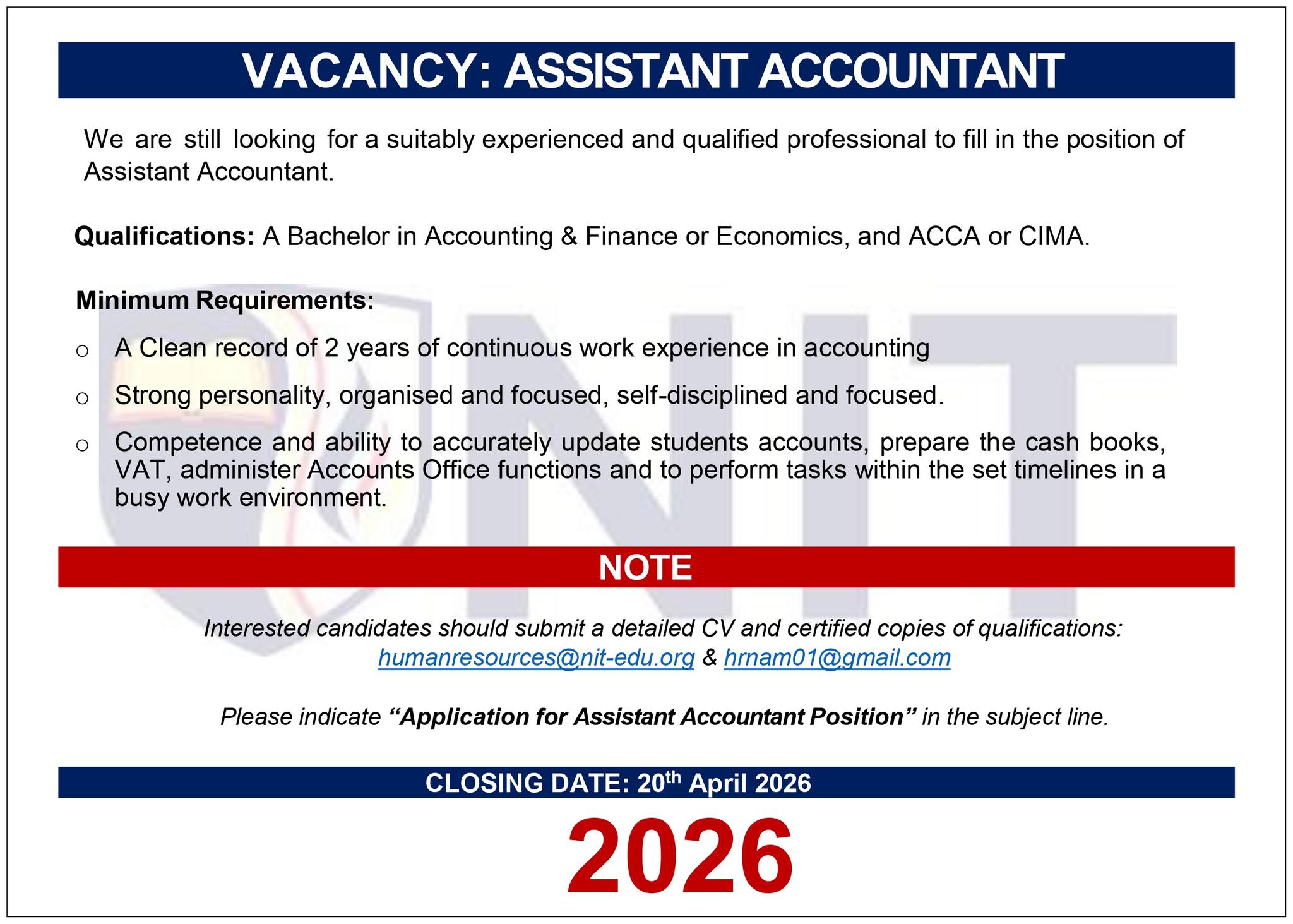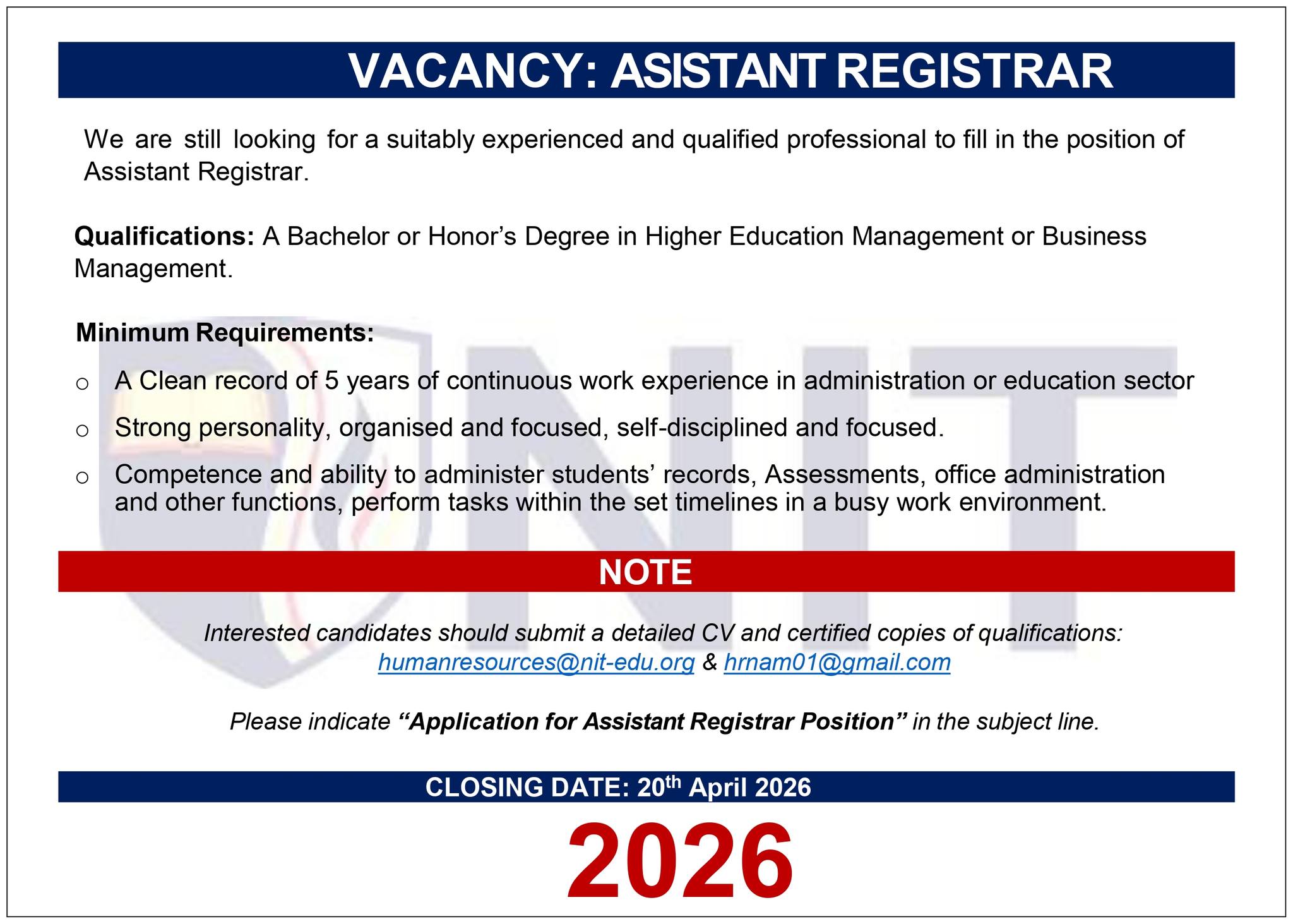 Latest Available NIT Namibia Vacancies 2026: