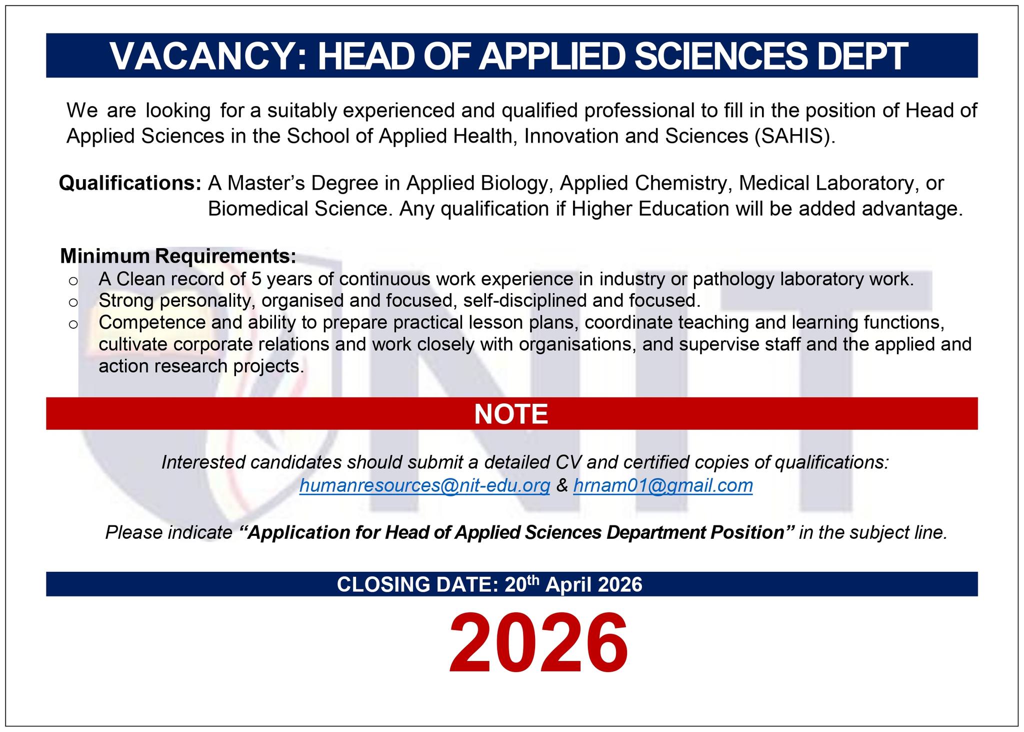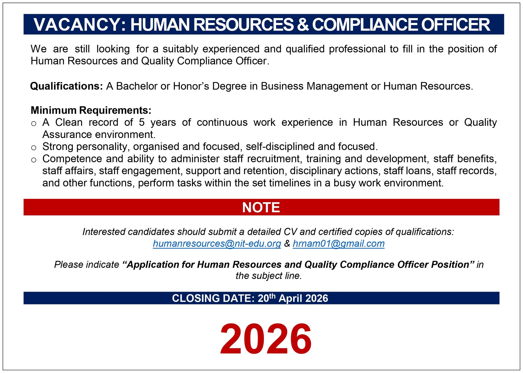 NIT Namibia Vacancy Portal 2026 Official Contact Details