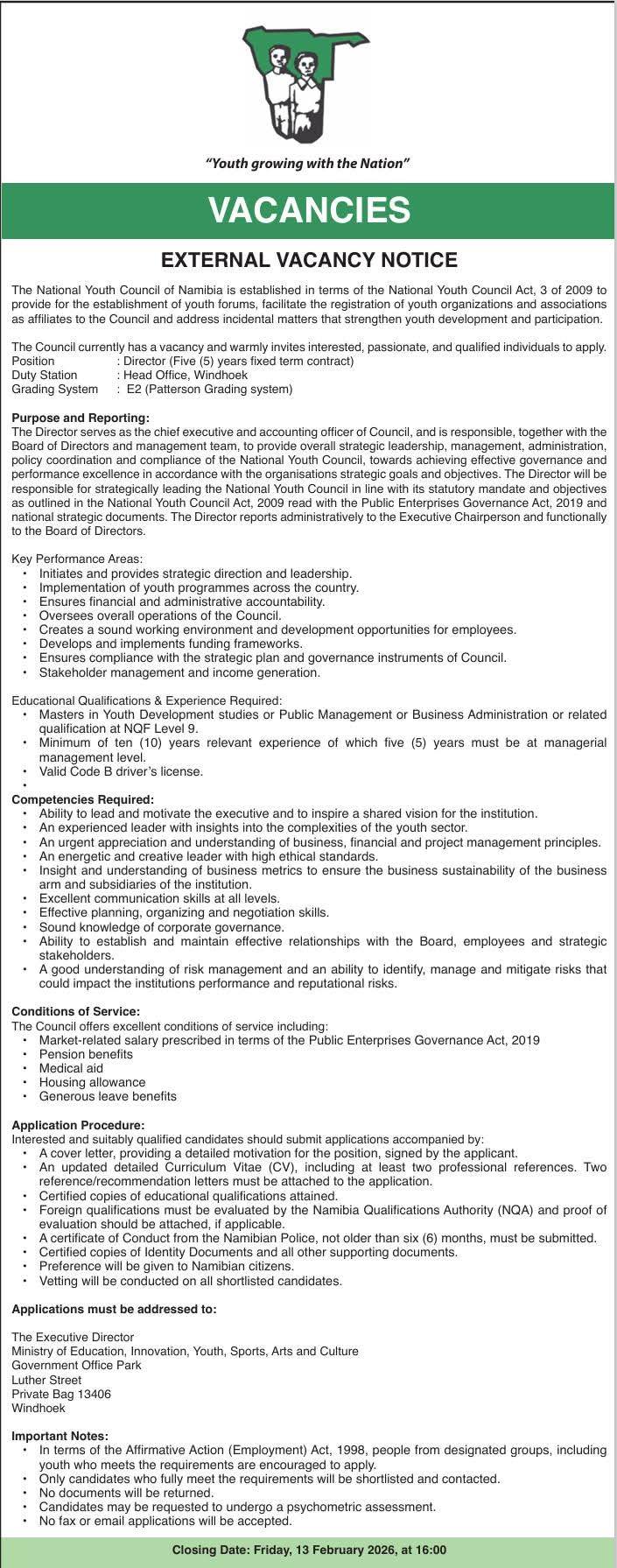 A: National Youth Council of Namibia is accepting Job applications for roles like Manager, Director, and other exciting Jobs.