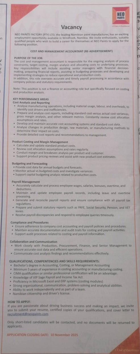 Namibian candidates seeking Neo Paints job opportunities have come to the right place! This article offers detailed information on Cost and Management Accountant, Sales Representative and various other job openings to help advance your career. For those interested in employment with the Namibian government and private companies, we provide up-to-date information on current Neo Paints job openings. The Neo Paints Vacancies Portal is known for frequently hiring for various government positions in Namibia, making it one of the most sought-after platforms. Additionally, you can download the Neo Paints Application Form 2025 PDF for Namibian government jobs directly from our website. Start your career journey today!
