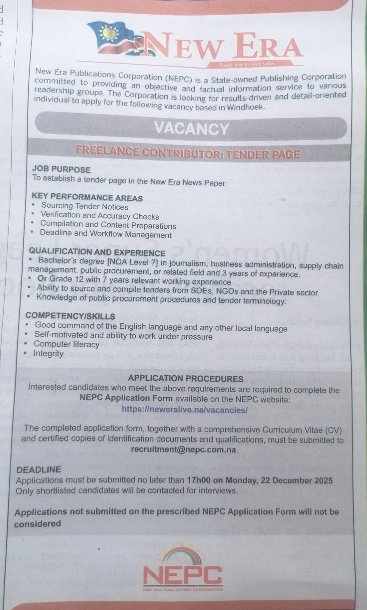 Apply for Freelance Contributor, Accountant and various job openings in Namibia. Submit your online application for New Era job opportunities through the recruitment portal at @neweralive.na. Our website provides a detailed step-by-step guide on how to apply for New Era job openings in Namibia. Stay informed with daily updates on the latest vacancy news and notices in Namibia.