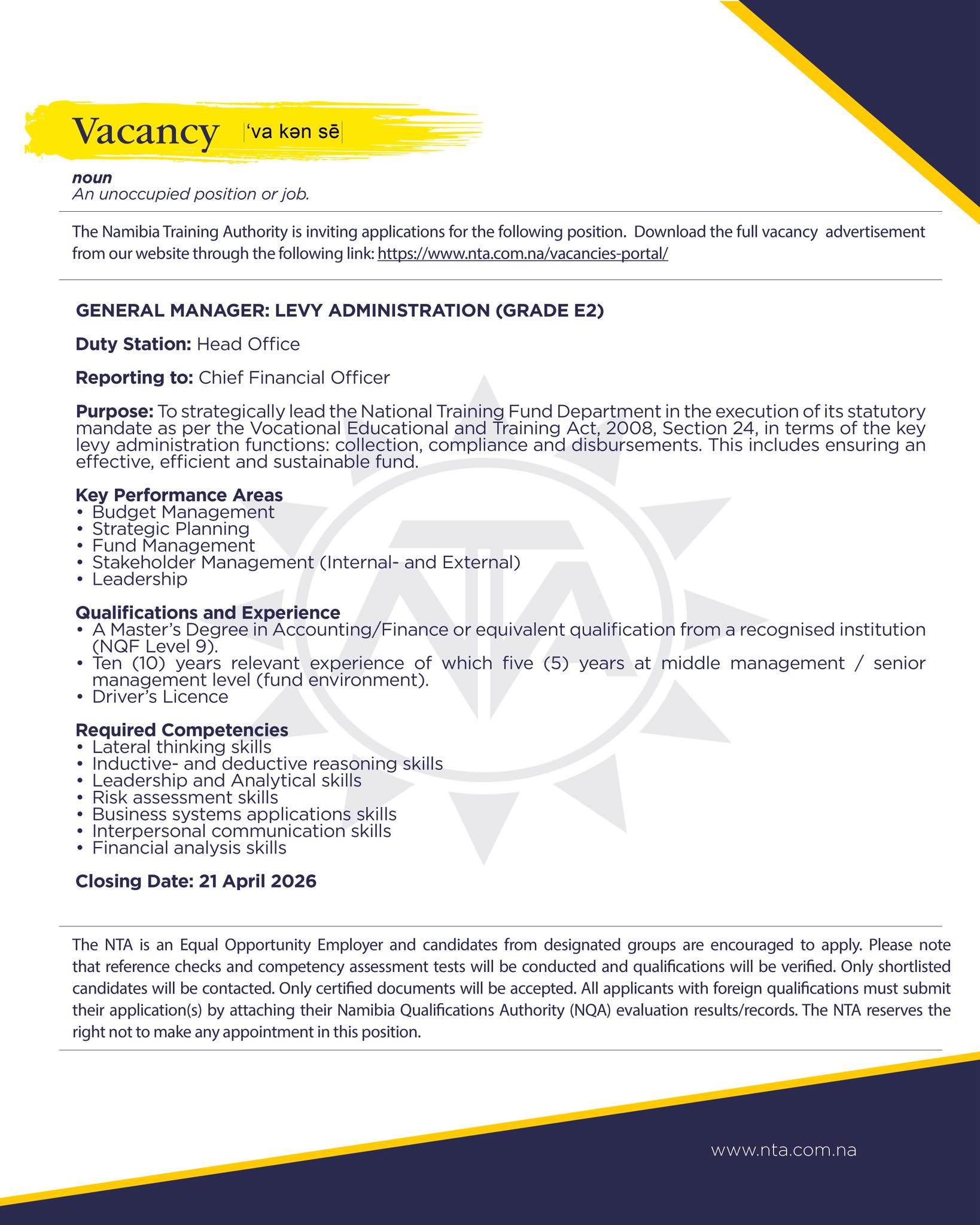 | ๐ข Hiring Department: | Namibia Training Authority Vacancies 2026 |