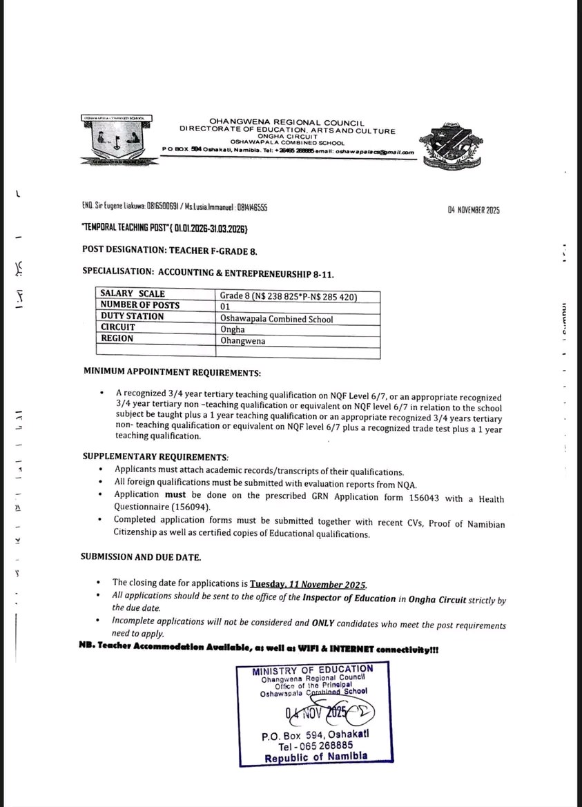 | 📢 Hiring Department: | Ohangwena Regional Council Vacancies 2025 |