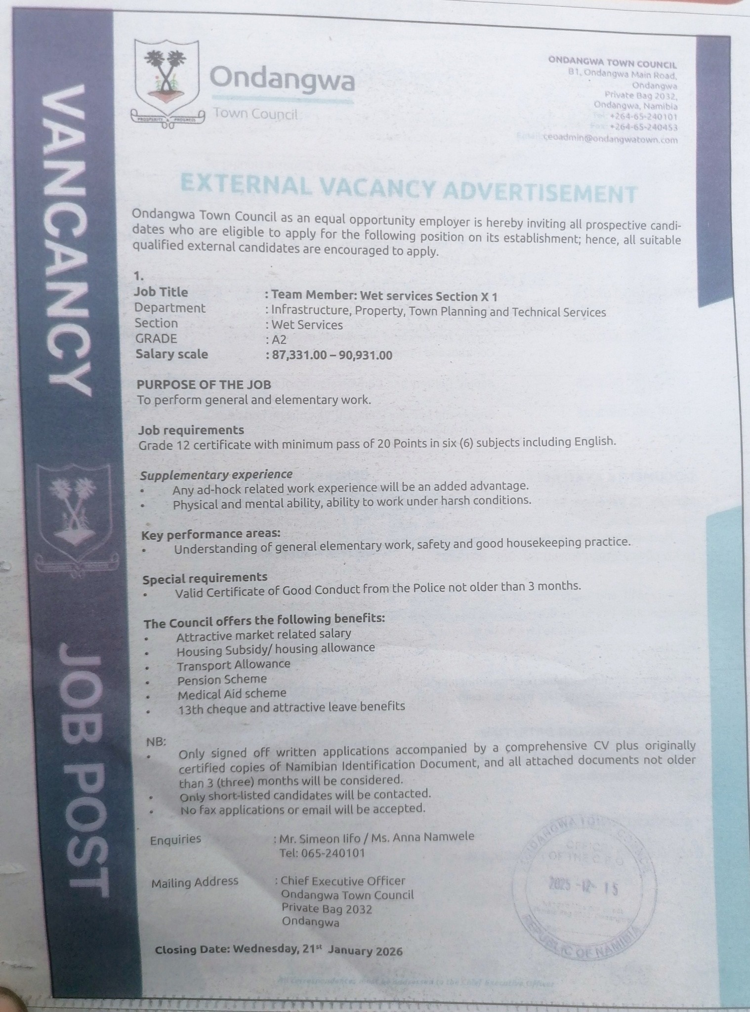Apply for Team Member and various job openings in Namibia. Submit your online application for Ondangwa Town Council job opportunities through the recruitment portal at @www.ondangwatc.org.na. Our website provides a detailed step-by-step guide on how to apply for Ondangwa Town Council job openings in Namibia. Stay informed with daily updates on the latest vacancy news and notices in Namibia.