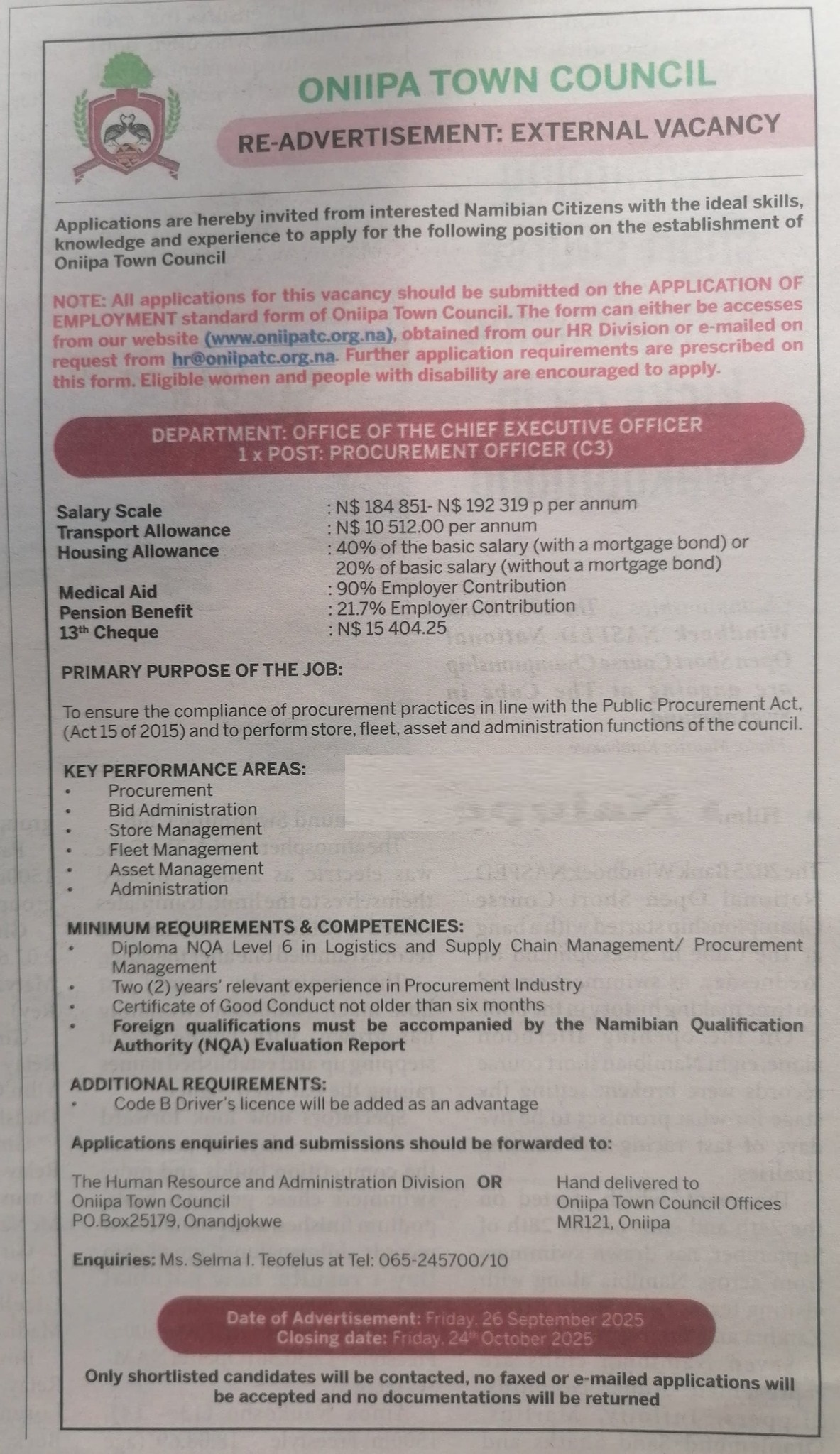 Apply for Procurement Officer and various job openings in Namibia. Submit your online application for Oniipa Town Council job opportunities through the recruitment portal at @oniipatc.org.na. Our website provides a detailed step-by-step guide on how to apply for Oniipa Town Council job openings in Namibia π³π¦. Stay informed with daily updates on the latest vacancy news and notices in Namibia π³π¦.