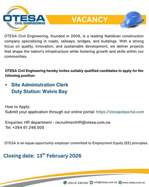 The OTESA Career Portal has announced a new batch of high-demand job openings today. You can apply based on your qualifications using the links provided on the page! Explore these exciting opportunities now on the OTESA Careers Portal at @www.otesa.com.na. Start your journey today with OTESA Vacancies. Positions are available in Windhoek, Swakopmund, Walvis Bay, Okahandja, Otjiwarongo, Rundu, and other cities across Namibia. Stay updated with the latest job openings in Namibia for 2026