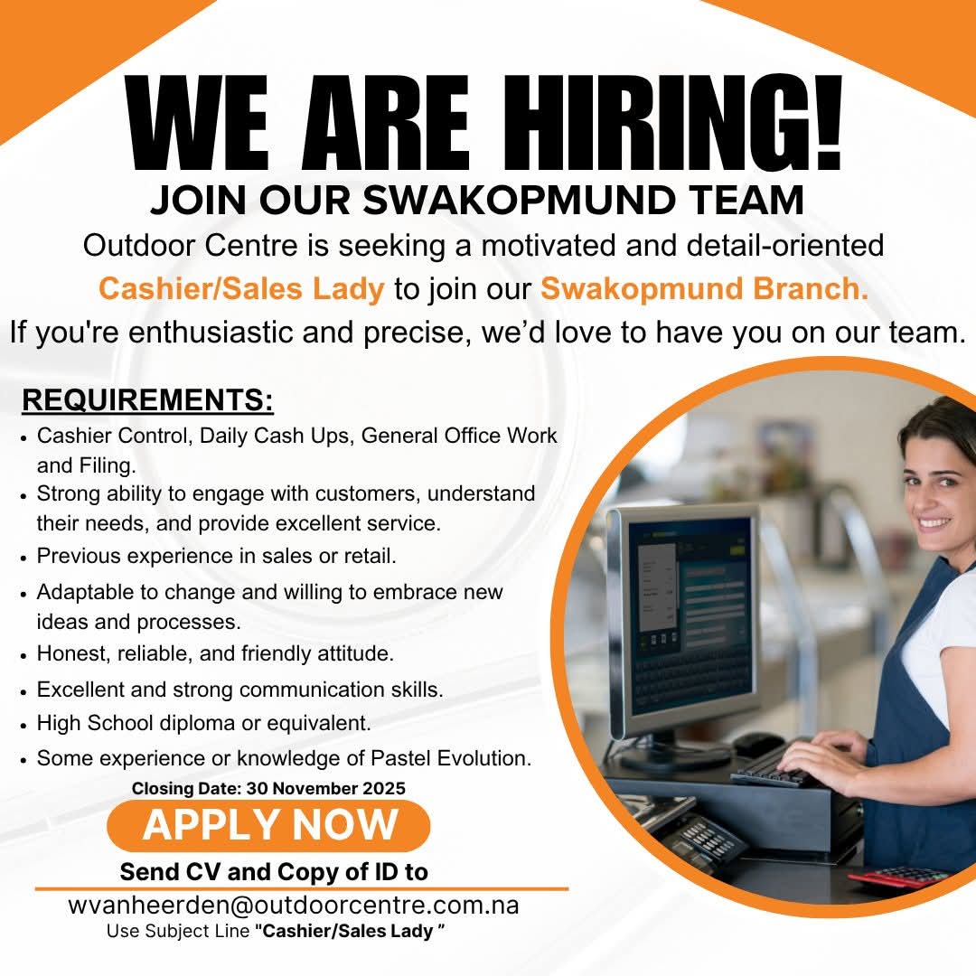 Namibian candidates seeking Outdoor Centre job opportunities have come to the right place! This article offers detailed information on Cashier/Sales Lady, Sales Specialist and various other job openings to help advance your career. For those interested in employment with the Namibian government and private companies, we provide up-to-date information on current Outdoor Centre job openings. The Outdoor Centre Vacancies Portal is known for frequently hiring for various government positions in Namibia, making it one of the most sought-after platforms. Additionally, you can download the Outdoor Centre Application Form 2025 PDF for Namibian government jobs directly from our website. Start your career journey today!