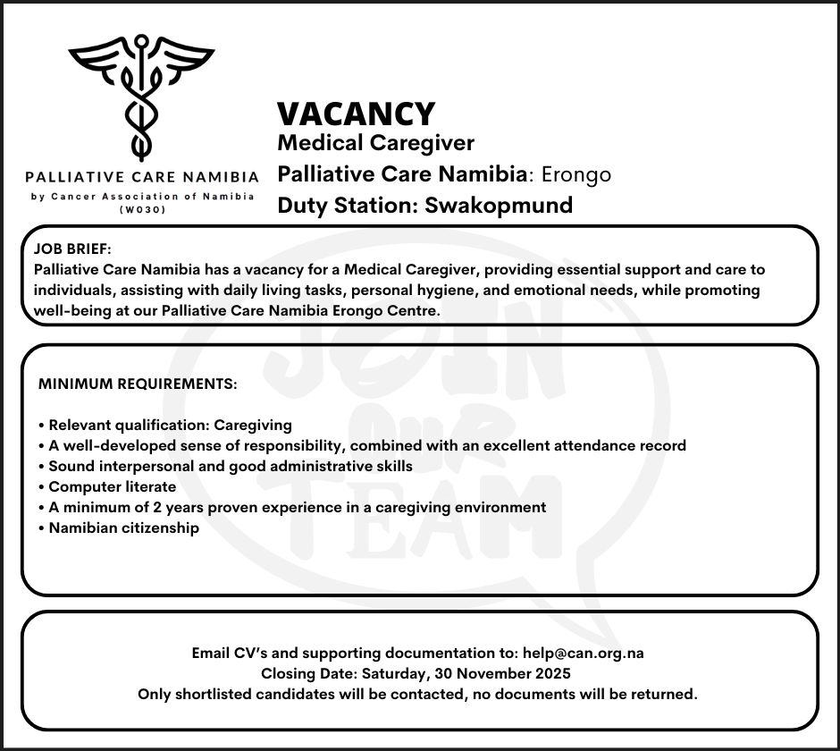 Namibian candidates seeking Palliative Care Namibia job opportunities have come to the right place! This article offers detailed information on Nurse, Medical Caregiver and various other job openings to help advance your career. For those interested in employment with the Namibian government and private companies, we provide up-to-date information on current Palliative Care Namibia job openings. The Palliative Care Namibia Vacancies Portal is known for frequently hiring for various government positions in Namibia, making it one of the most sought-after platforms. Additionally, you can download the Palliative Care Namibia Application Form 2025 PDF for Namibian government jobs directly from our website. Start your career journey today!