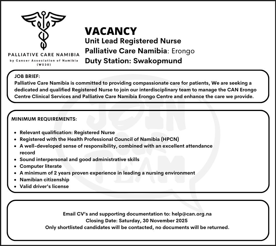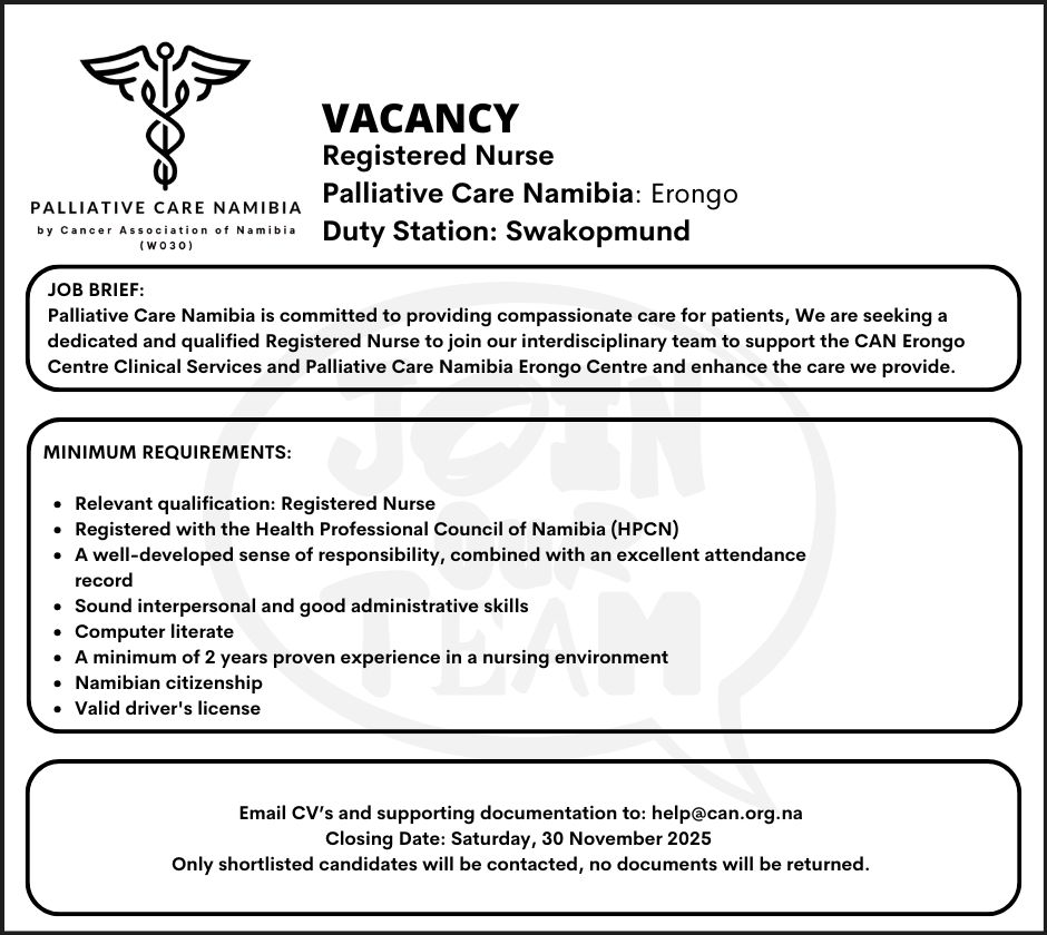 Apply for Nurse, Medical Caregiver and various job openings in Namibia. Submit your online application for Palliative Care Namibia job opportunities through the recruitment portal at @pcn.org.na. Our website provides a detailed step-by-step guide on how to apply for Palliative Care Namibia job openings in Namibia π³π¦. Stay informed with daily updates on the latest vacancy news and notices in Namibia π³π¦.