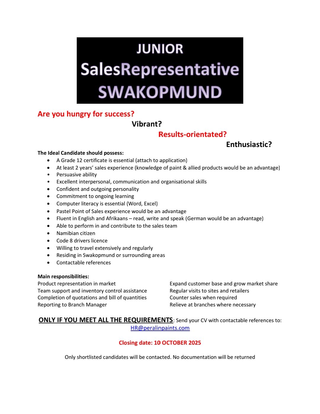 • Applicants need a Grade 12 certificate, at least 2 years of sales experience (paint knowledge is a plus), computer literacy (Word, Excel), and a Code 8 driver’s license. Fluency in English and Afrikaans is essential, and German is an advantage.