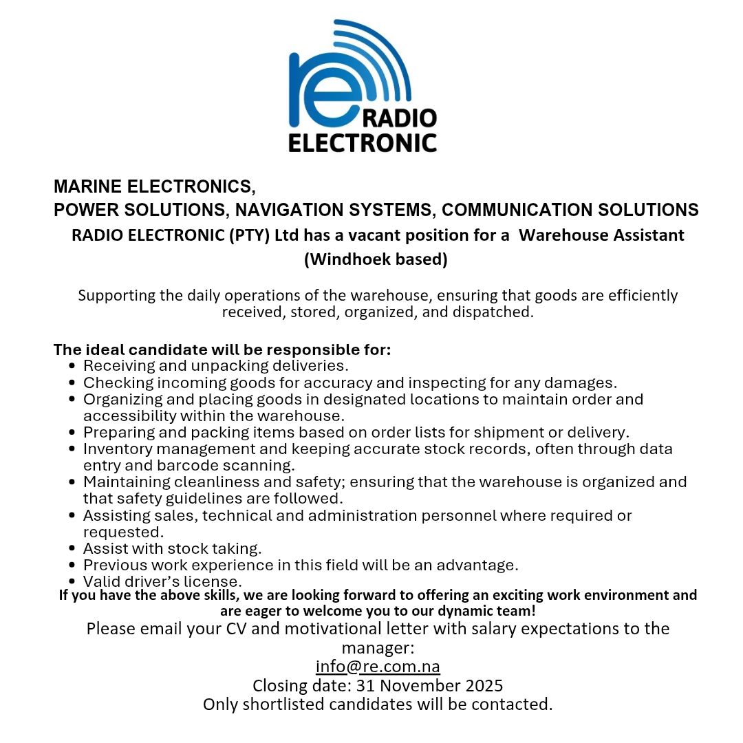 Discover the latest Radio Electronic Vacancies for 2025! Apply for Warehouse Assistant and various other positions through the @www.re.com.na Job Portal. Start your application today and take the next step in your career! π³π¦